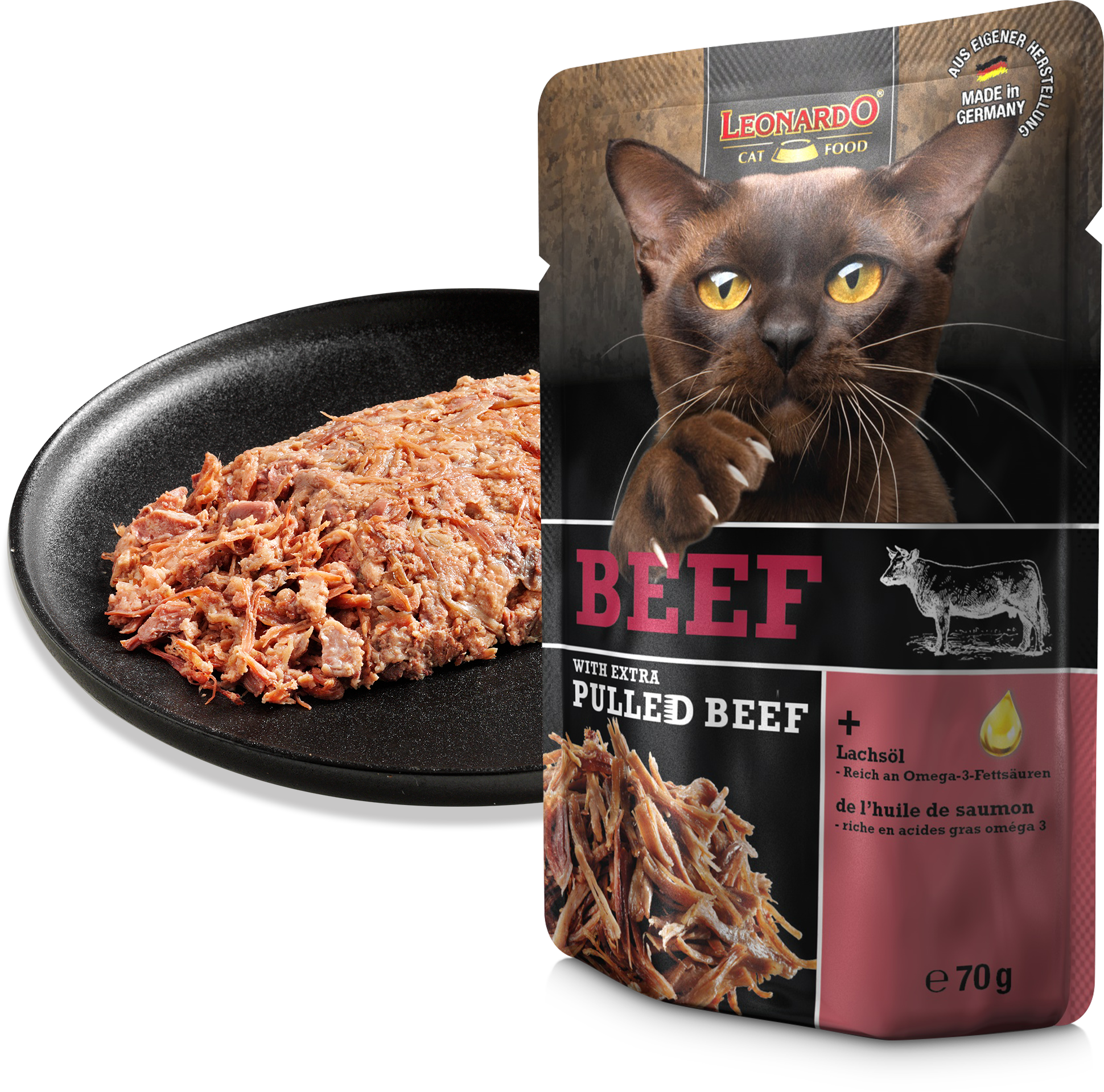 LEONARDO Beef + extra pulled Beef este es un jugoso paté de ternera, combinado con carne desmenuzada Sea una barbacoa con carne desmenuzada o una hamburguesa con carne desmenuzada en el restaurante – la «experiencia de masticar» única y el sabor especial de la carne desmenuzada es inolvidable. Con el nuevo «LEONARDO Pulled Beef» los gatos ahora pueden disfrutar exactamente de esta experiencia! Cada porción es cocinada suavemente y refinada con aceite de salmón. El aceite de salmón suministra ácidos grasos poliinsaturados para un pelaje particularmente sedoso.