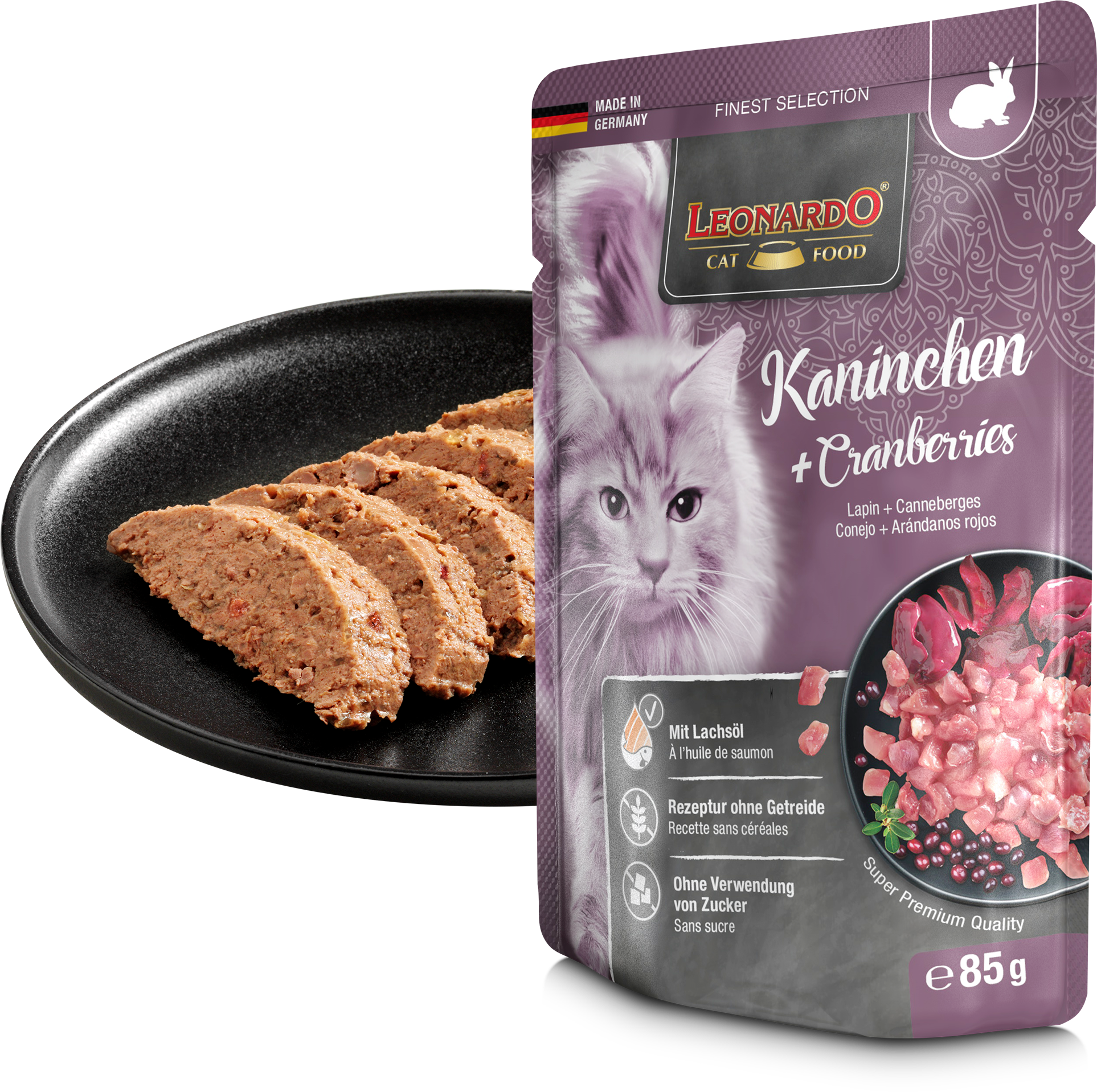 Esta combinación de carne de conejo aromático y arándanos rojos, el superalimento con muchos ingredientes valiosos, es realmente sabrosa. Y también es buena para el pelaje: ¡Leonardo Conejo + Arándanos hace brillar el pelaje gracias a los ácidos grasos poliinsaturados del aceite de salmón!