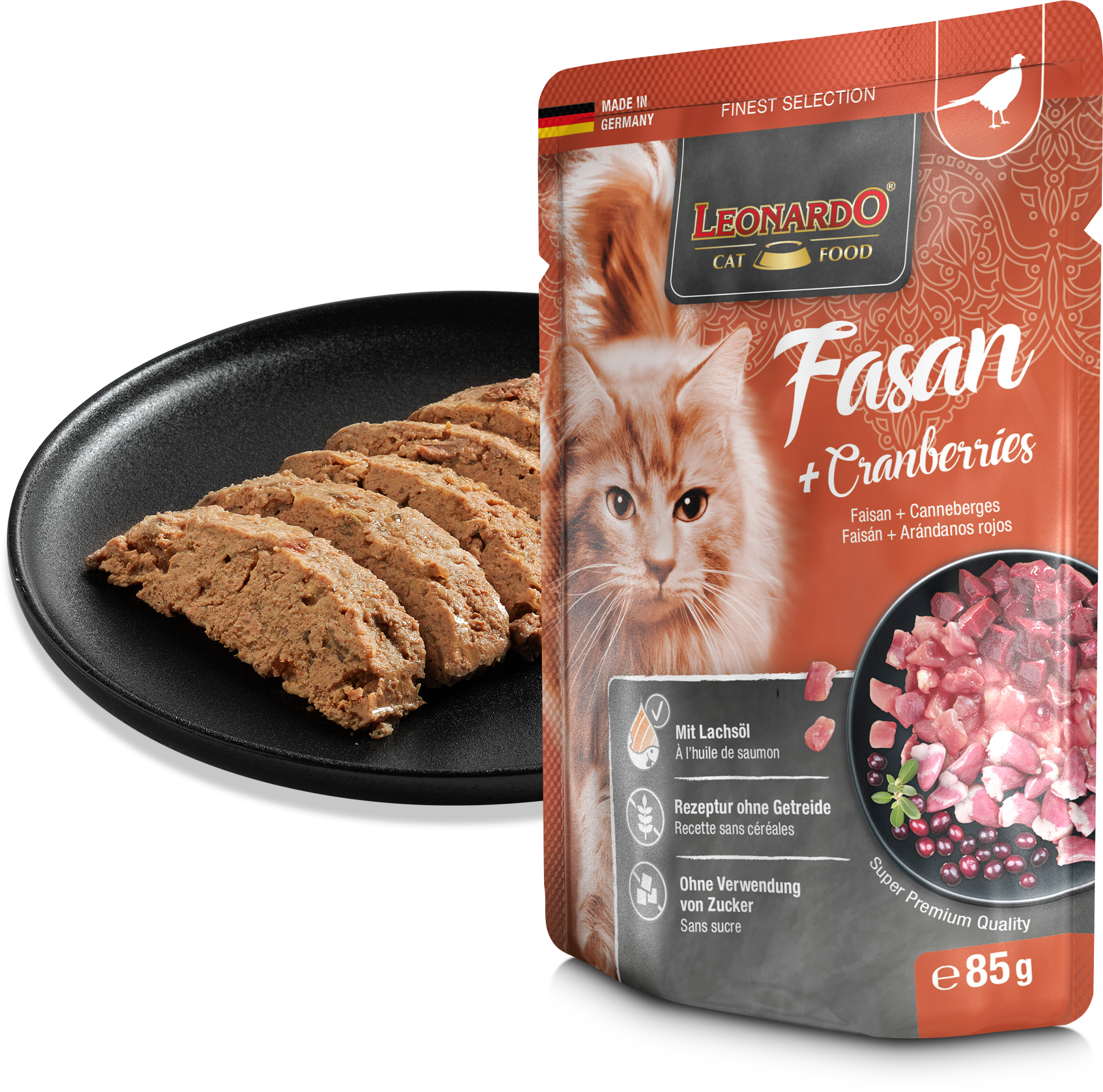 Un capricho salvaje: la carne de faisán es ideal para los pequeños gourmets. Mejor aún cuando su suave sabor a caza se ve realzado por la agradable nota de los arándanos rojos. Y lo mejor de todo es que este superalimento está repleto de antioxidantes y vitaminas. Pero LEONARDO Faisán + Arándanos puede hacer aún más: por ejemplo, puede hacer que el pelo de tu peludo brille, gracias a los ácidos grasos poliinsaturados del aceite de salmón.