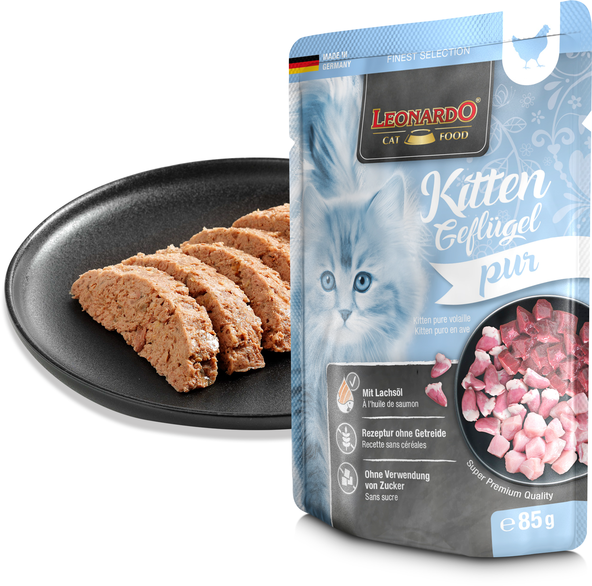 Gran calidad para los más pequeños: carne de ave combinada con vÃsceras ricas en nutrientes – esta receta, especialmente adaptada a los gatitos pequeños, es fácil de digerir y ofrece todo lo que su gatito necesita para empezar su vida con buen pie. LEONARDO Kitten puro en ave contiene aceite de salmón, que aporta ácidos grasos poliinsaturados.