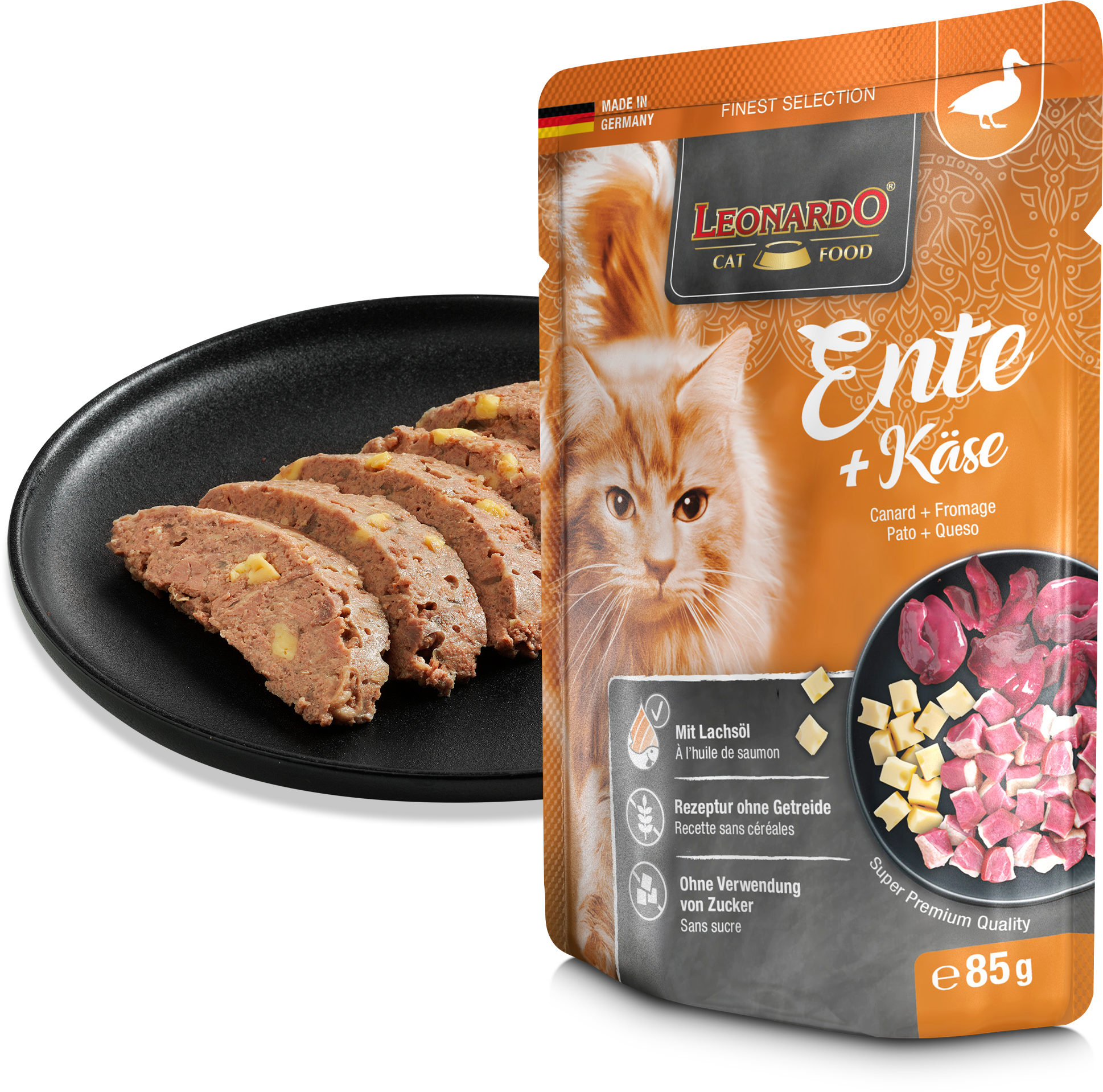 Un pequeño extra: el pato aporta mucho sabor al plato y los dados de queso ofrecen una sorpresa especialmente suculenta. Con valiosos ácidos grasos omega-3, también aumentan el bienestar de nuestros amigos de cuatro patas. Otra ventaja de LEONARDO Pato + Queso: un pelaje suave y brillante gracias a los ácidos grasos poliinsaturados del aceite de salmón.