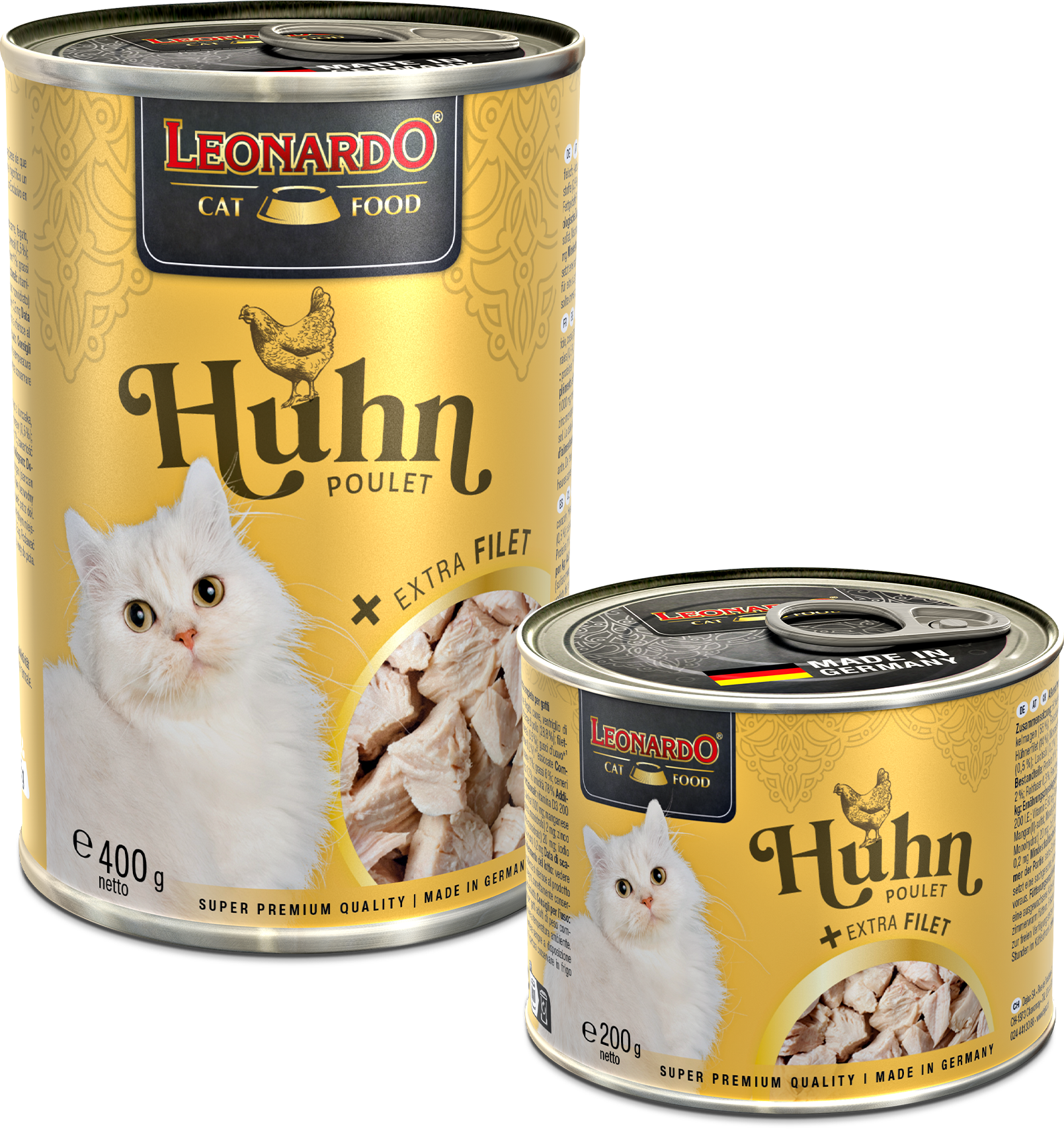 Nuestro suculento menú con filete para disfrutar del pollo en estado puro. Un alto contenido de carne de pollo de la mejor calidad, enriquecido con trozos de filete extra sabrosos. Cocinada suavemente en su propio jugo, se convierte en una irresistible delicia de carne con una experiencia de masticación especial. El aceite de salmón da el toque final a las recetas y aporta ácidos grasos poliinsaturados para un pelaje sedoso. Naturalmente sin azúcar ni colorantes, saborizantes ni conservantes artificiales.