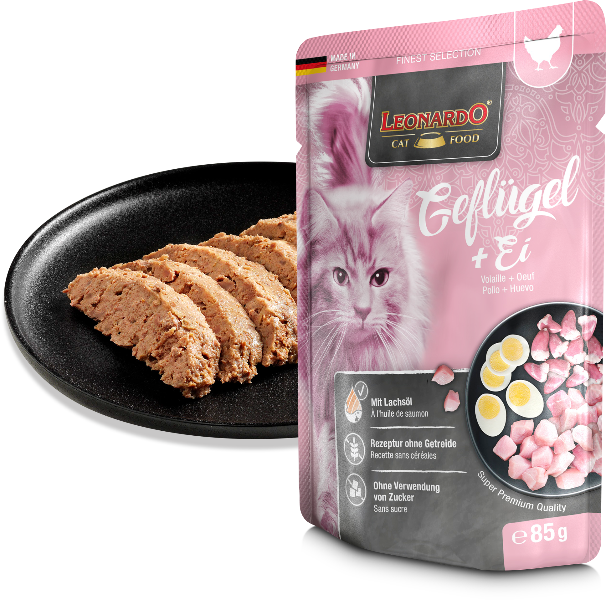 Combinación gourmet: la carne de ave tierna y baja en grasas y el huevo son valiosas fuentes de energía para una dieta equilibrada. Combinada con deliciosa carne de vacuno, esta variedad es un auténtico festín para los amigos de cuatro patas. Además, el aceite de salmón con ácidos grasos poliinsaturados favorece un pelaje sano y brillante.
