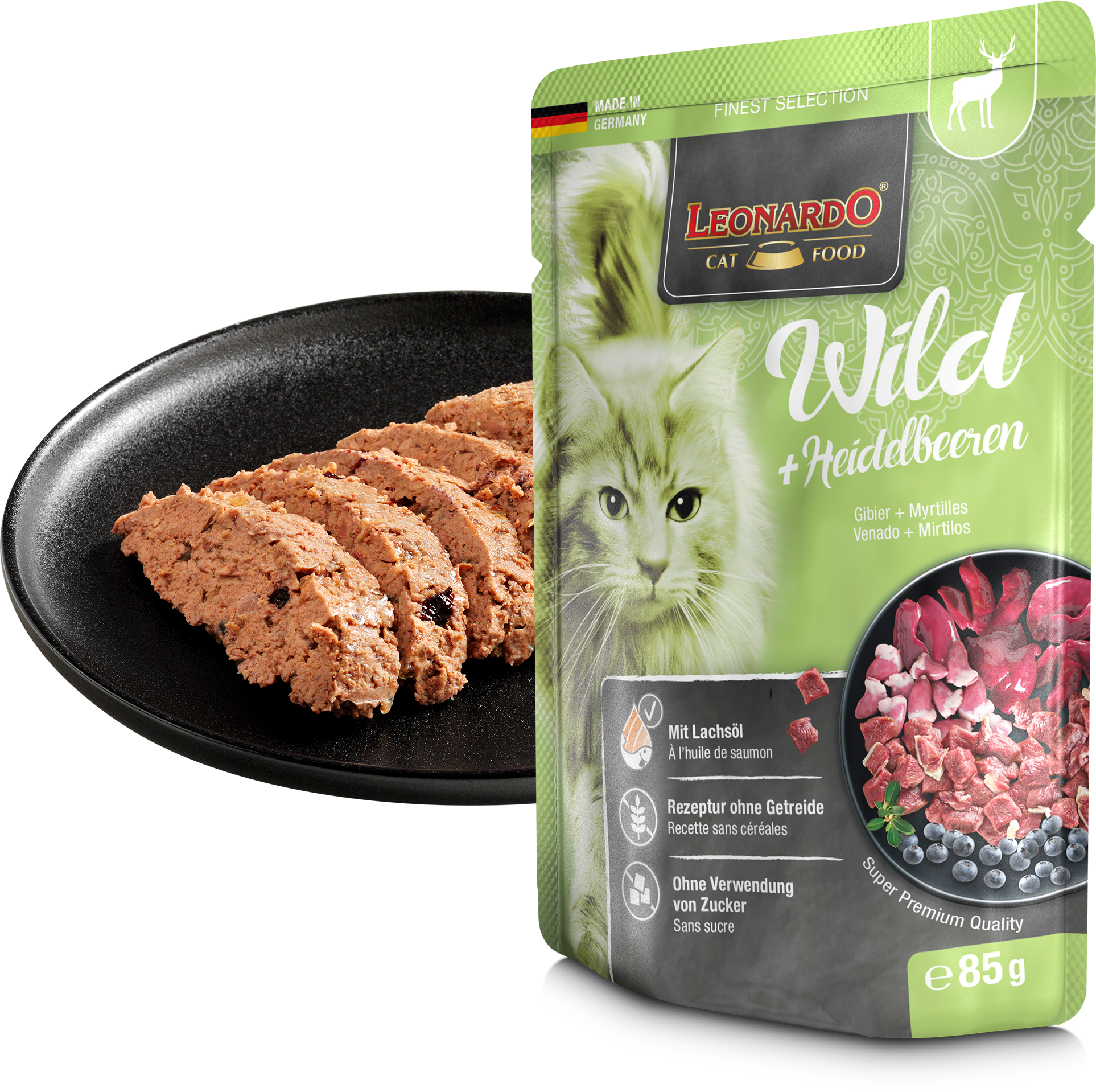 Composición: Corazón, hÃgado y mollejas de ave (37 %); carne de caza (30 %); caldo de carne (29,8 %); mirtilos (2 %); cáscaras de huevo*¹ (0,5 %); minerales (0,5 %); aceite de salmón (0,2 %) *¹secado.
