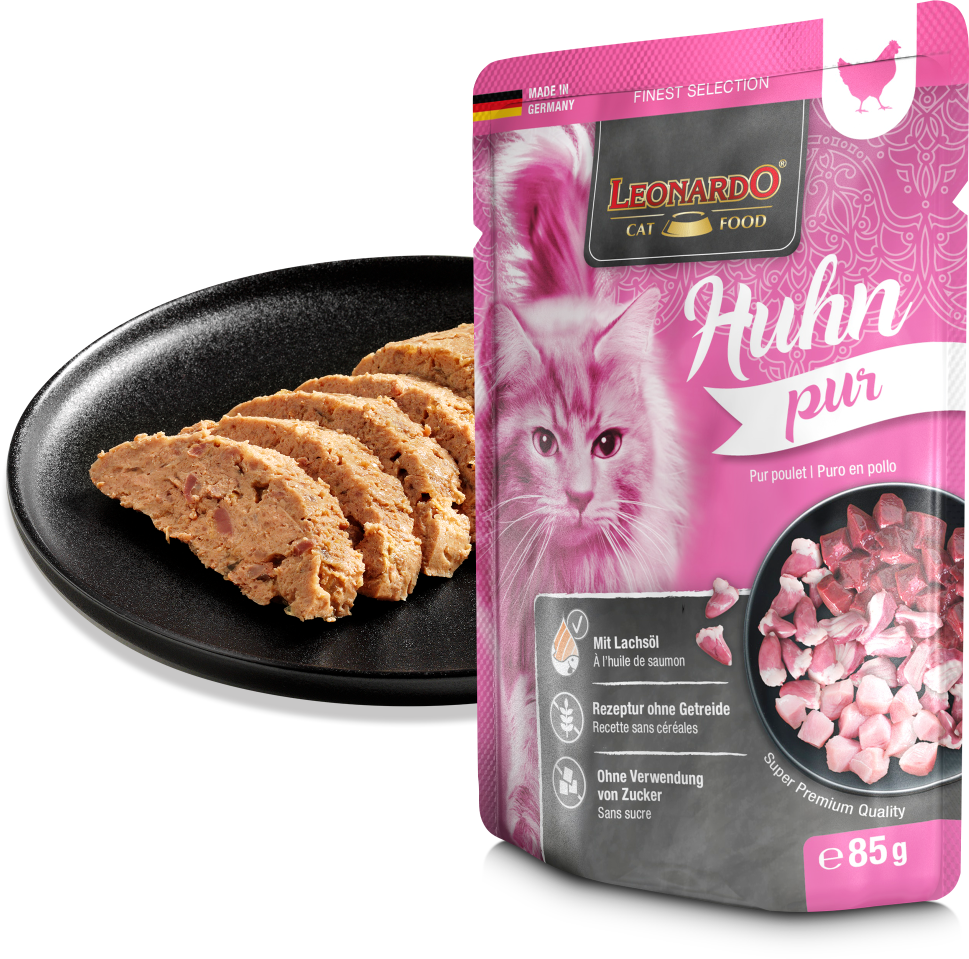 Para puristas: La irresistible mezcla de carne magra de pollo de alta calidad, sabrosos despojos y aceite de salmón con ácidos grasos poliinsaturados hace que LEONARDO puro en pollo sea un claro favorito en el cuenco. Aumenta el factor ronroneo y da un bonito brillo al pelaje.
