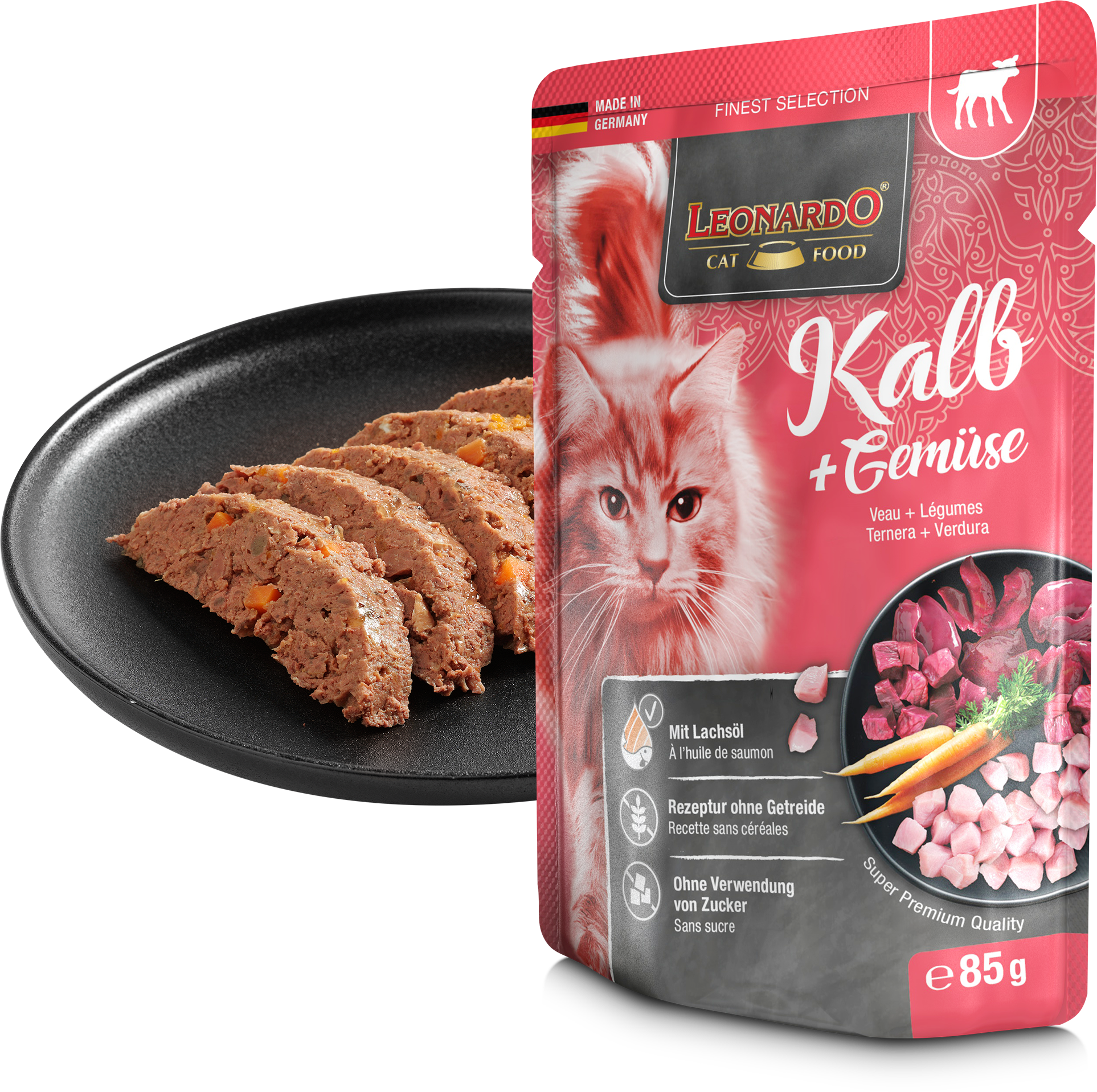 Aquí triunfan los amantes de las verduras: además del ingrediente principal, una tierna carne de ternera de primera calidad, LEONARDO Ternera + Verduras contiene lo mejor del huerto en forma de zanahorias cuidadosamente cocinadas. El aceite de salmón con ácidos grasos poliinsaturados también hace brillar el pelaje.