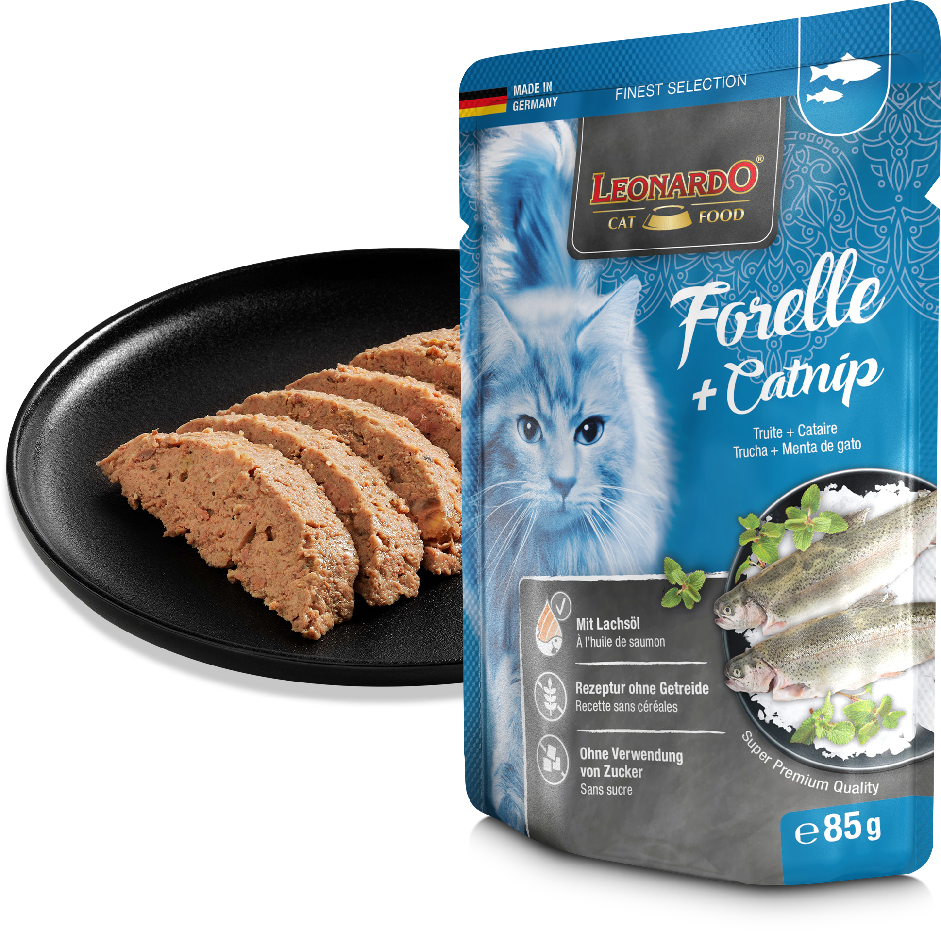 Atrae mágicamente a los gatos: La trucha tierna como fuente de proteÃnas de alta calidad, que aporta valiosos ácidos grasos omega 3, y la hierba gatera, que atrae de forma natural a tu peludo: ¡esto hace de LEONARDO Trucha + Menta gatuna una combinación irresistible, que garantiza un pelo brillante gracias a los ácidos grasos poliinsaturados del aceite de salmón!
