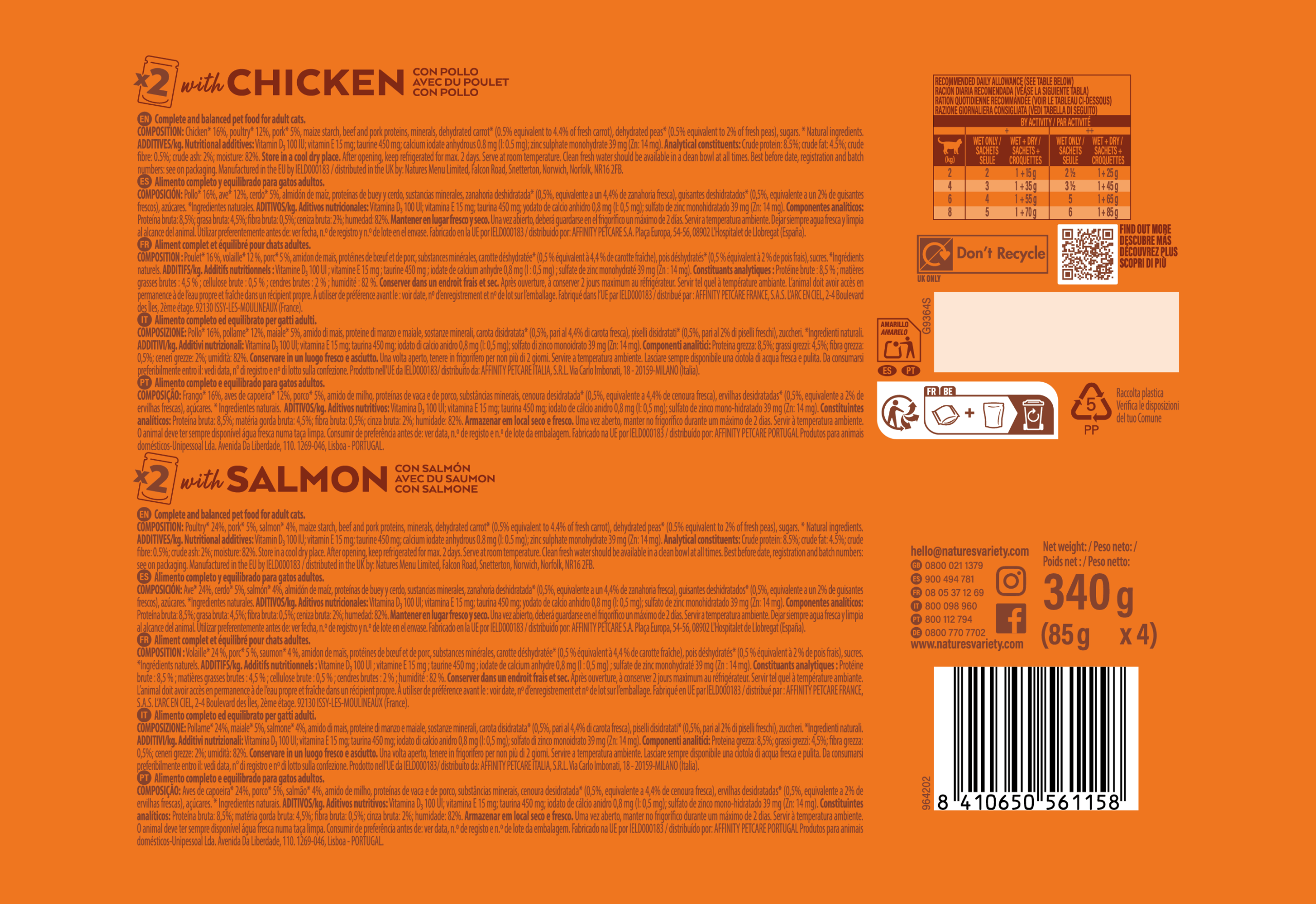 Ingredientes: 2 x pollo: Ave* 24,4%, cerdo* 5%, pollo* 4%, almidón de maíz, proteínas de cerdo y buey, sustancias minerales, zanahoria deshidratada* (0,5%, equivalente a un 3,4% de zanahoria fresca), guisantes deshidratados* (0,5%, equivalente a un 1,8% de guisantes frescos), azúcares. 2 x salmón: Ave* 24,4%, cerdo* 5%, salmón* 4%, almidón de maíz, proteínas de cerdo y buey, sustancias minerales, zanahoria deshidratada* (0,5%, equivalente a un 3,4% de zanahoria fresca), guisantes deshidratados* (0,5%, equivalente a un 1,8% de guisantes frescos), azúcares. *Ingredientes naturales.
