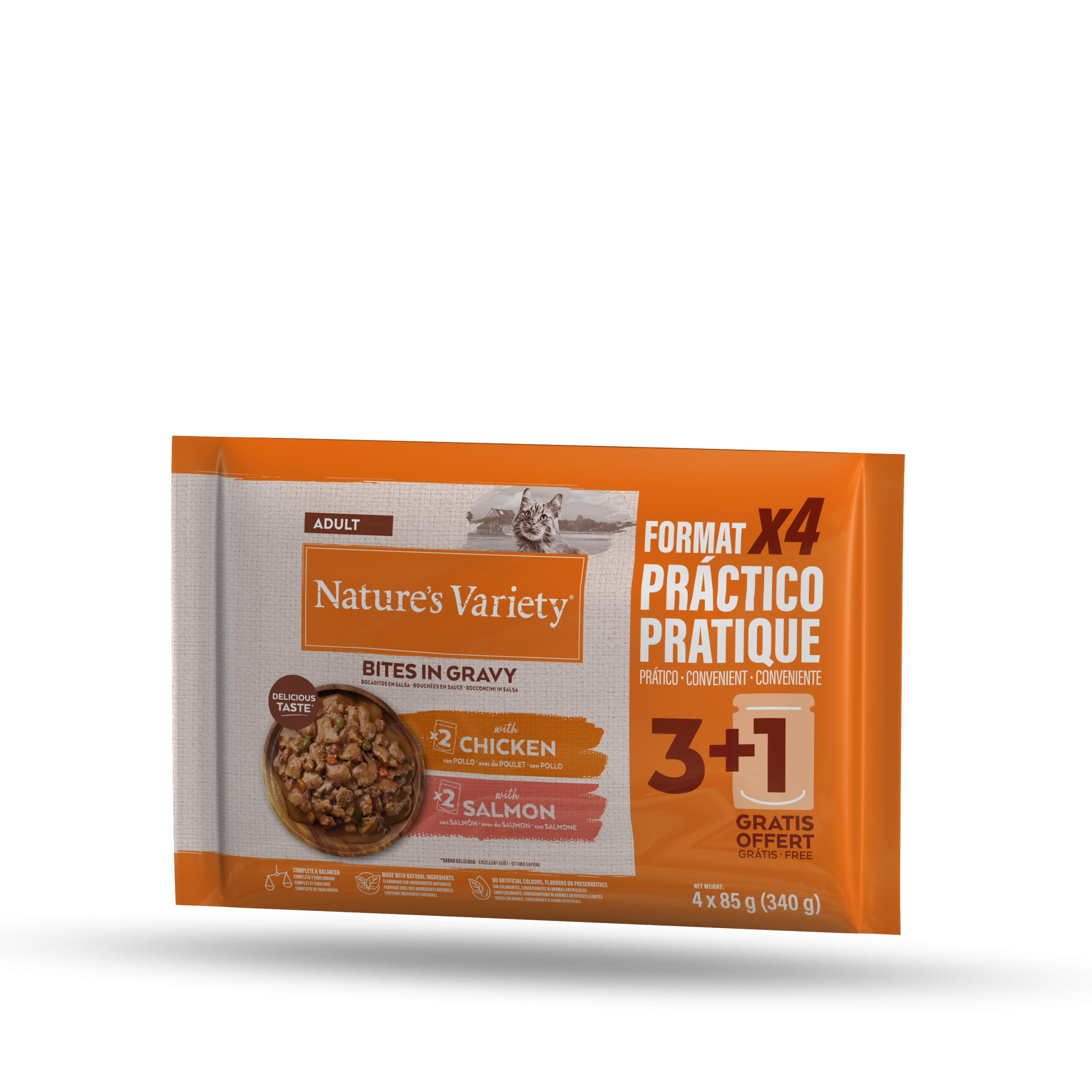 Bocaditos en salsa con pollo o salmón. Cocidos al vapor a temperatura óptima en su propio jugo para preservar mejor los nutrientes