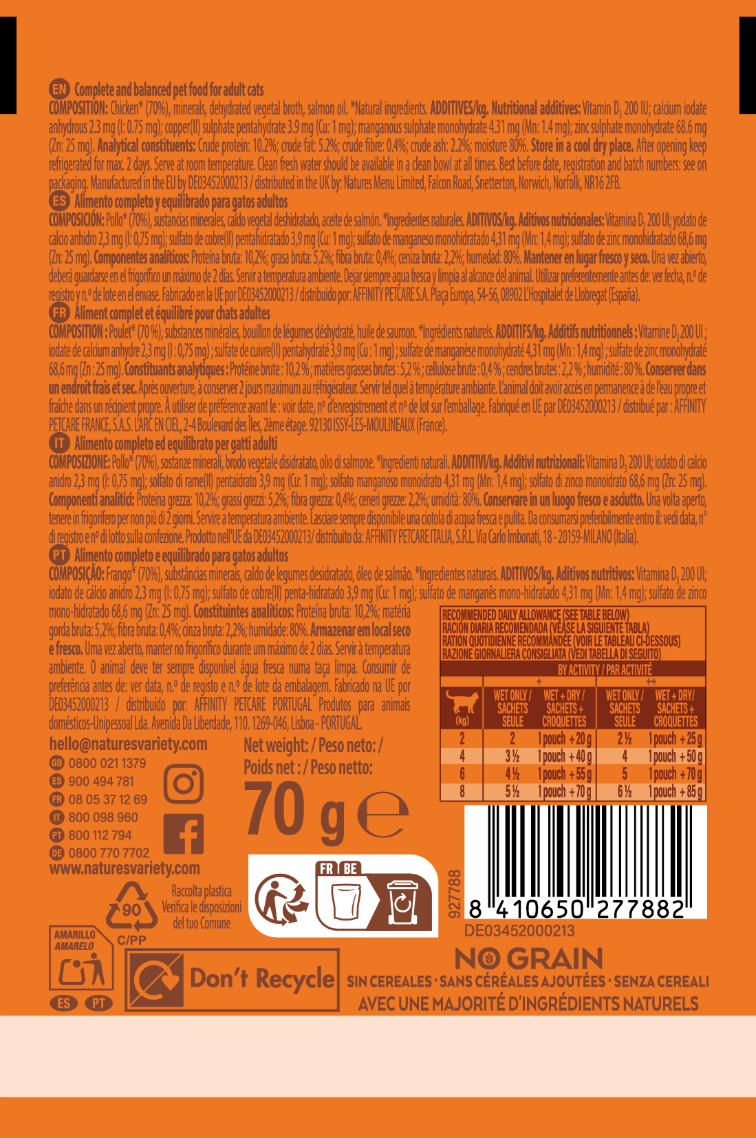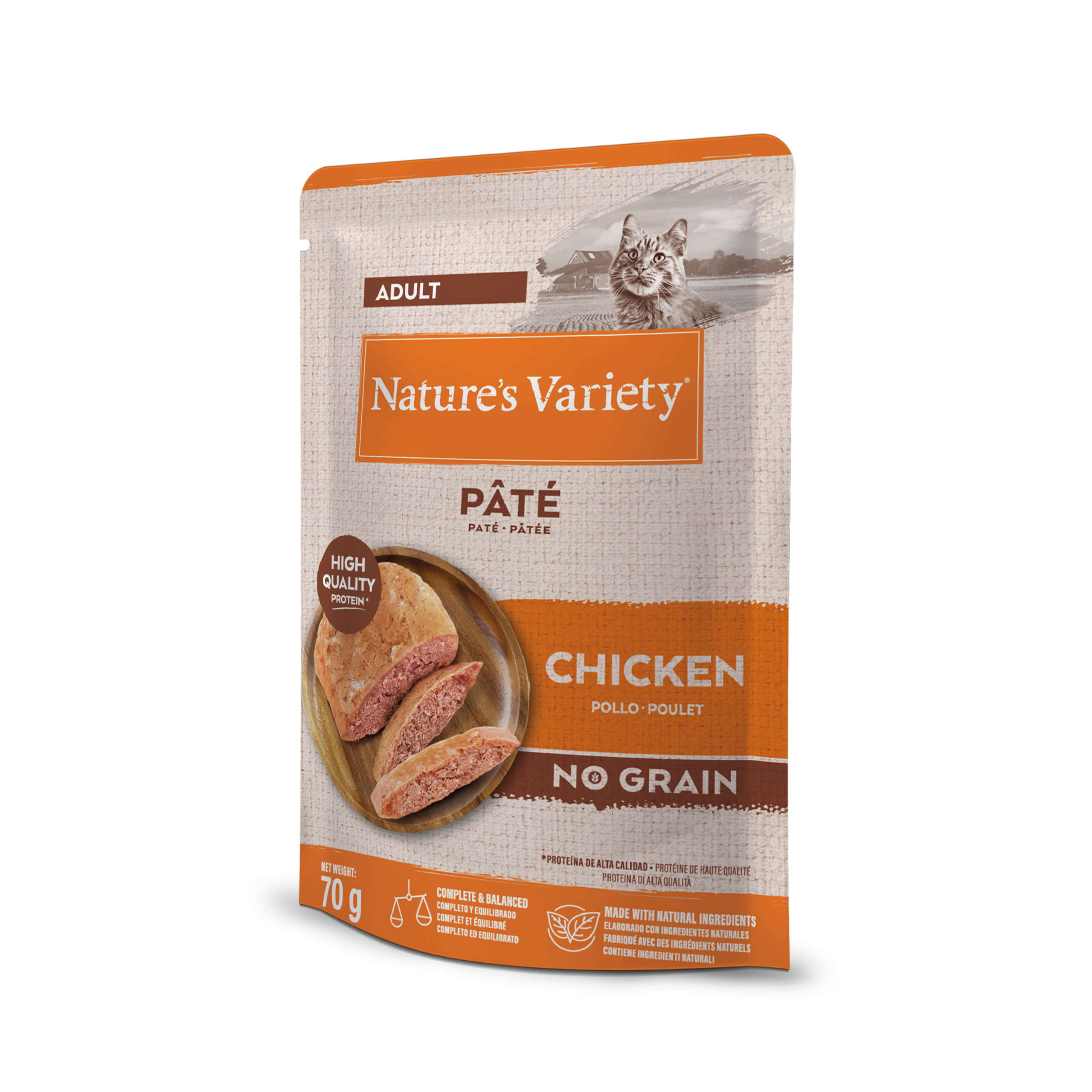 Alimento completo y equilibrado para gatos adultos , sin cereales. Con pollo de alta calidad como ingrediente principal. Cocido al vapor a temperatura óptima en sus propios jugos para preservar mejor los nutrientes.