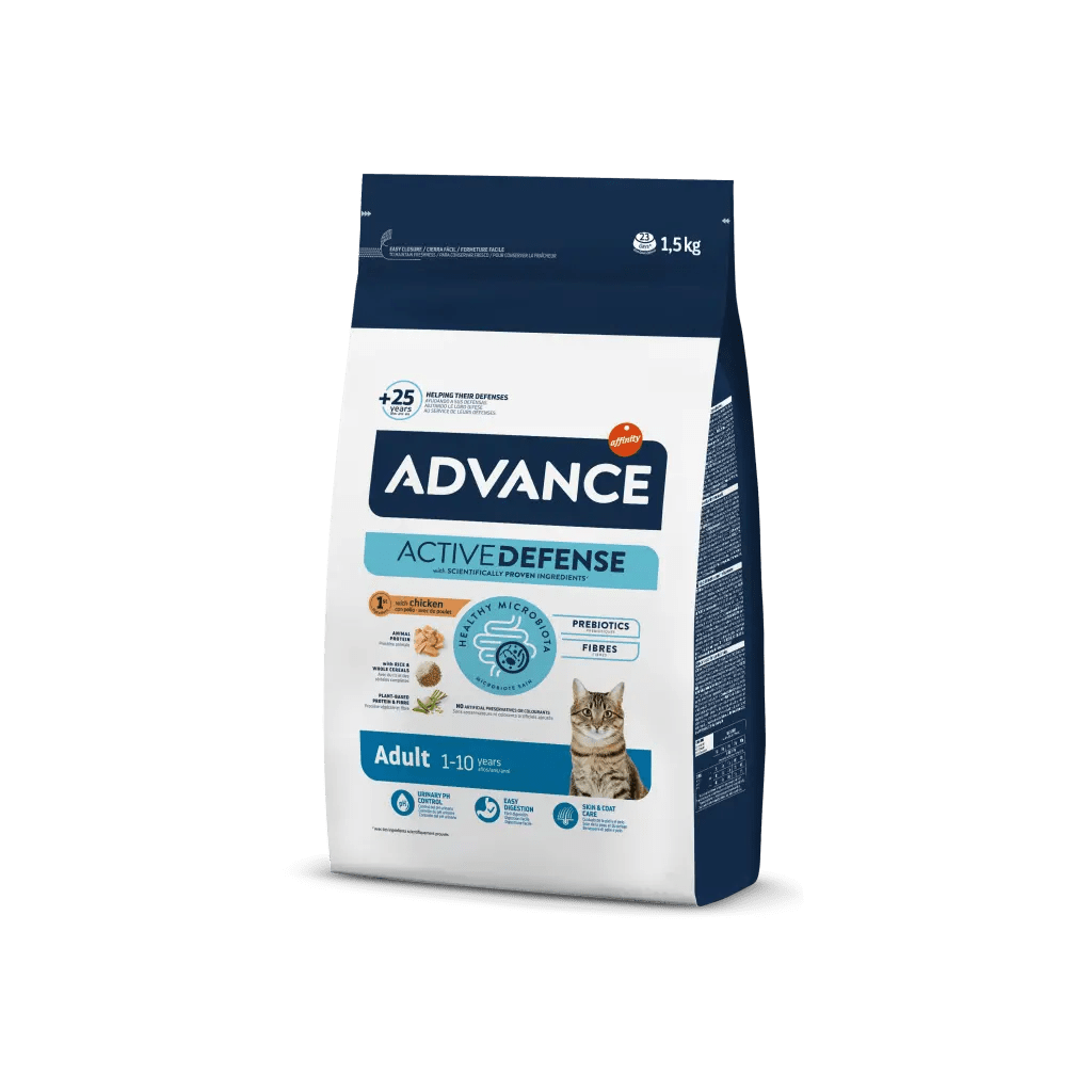 Una vez que tu gato ha alcanzado la etapa adulta sus necesidades nutricionales cambian y necesita un alimento que le ayude a mantener una condición corporal ideal durante la etapa más larga de su vida. ADVANCE Adult es un alimento de alta gama, fácil de digerir y formulado para cubrir sus necesidades específicas. Facilita el correcto funcionamiento de sus defensas y barreras naturales y le ayuda a mantener un pH óptimo de la orina, a controlar el sarro y favorece la salud intestinal, la piel sana y el pelo brillante. ADVANCE Adult está especialmente formulado para gatos sin esterilizar de a partir de 1 año.