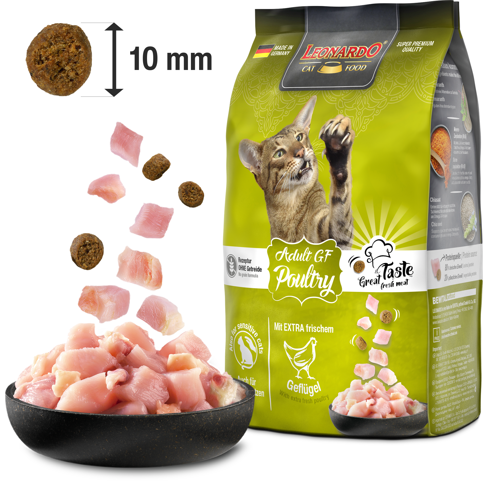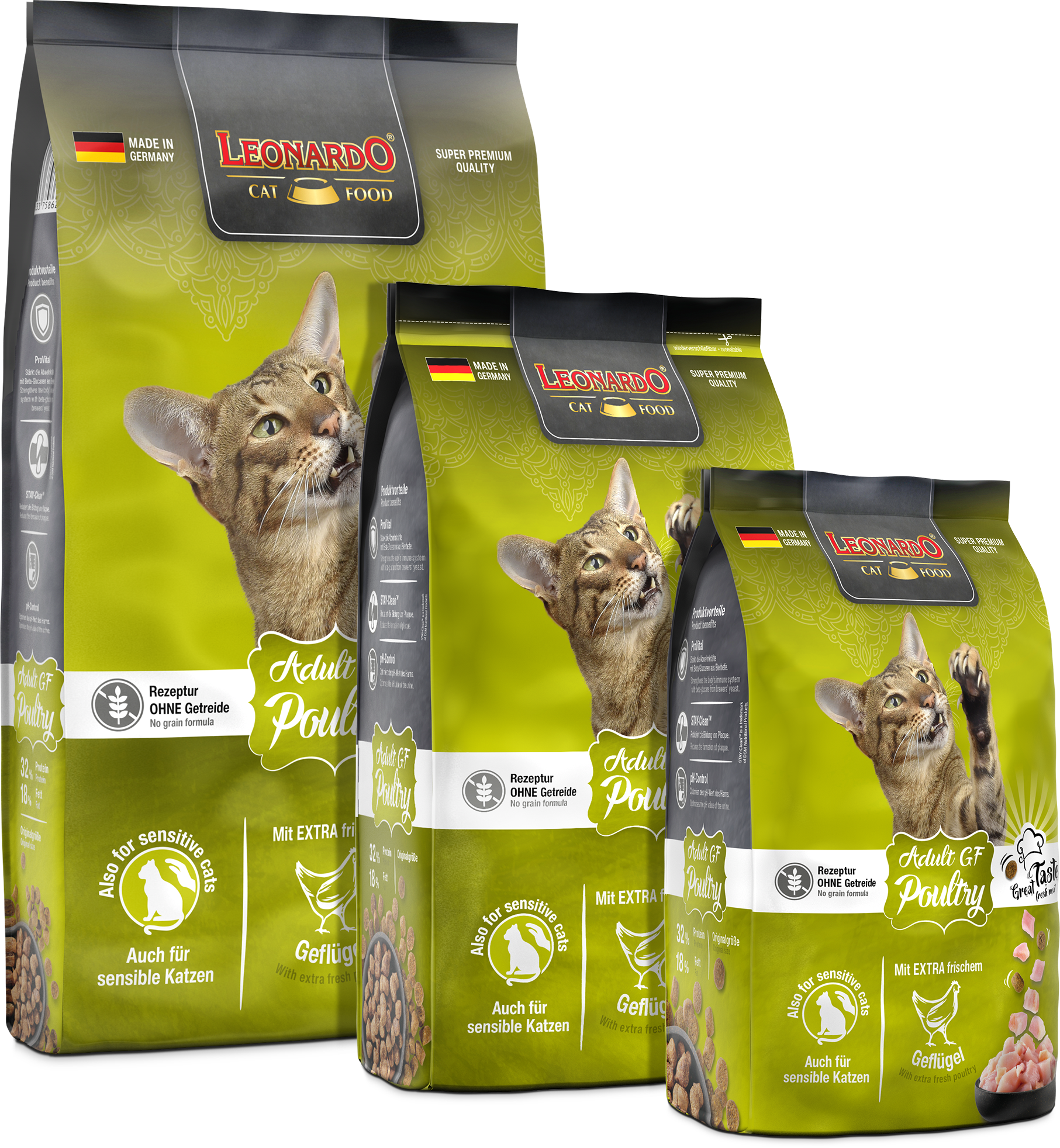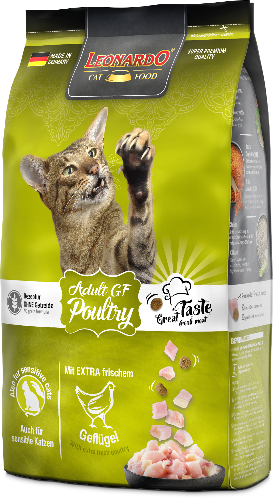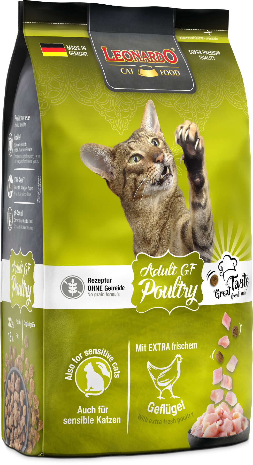 La receta de LEONARDO Adult GF Poultry no contiene gluten ni cereales. En esta composición el amaranto, rico en nutrientes, sustituye los cereales. LEONARDO Adult GF Poultry es la solución perfecta para gatos con intolerancias alimentarias o tendencia a padecer alergias.