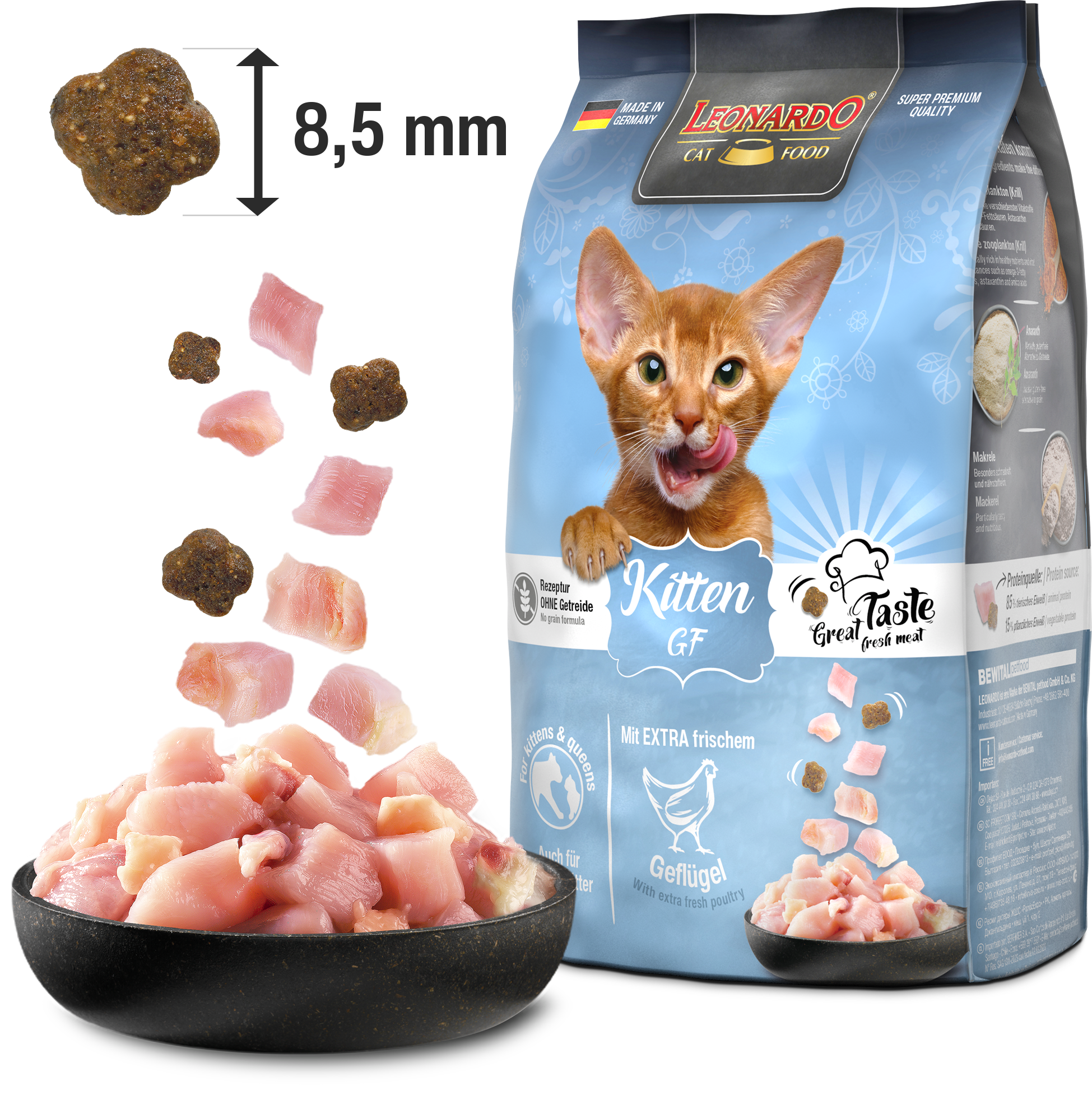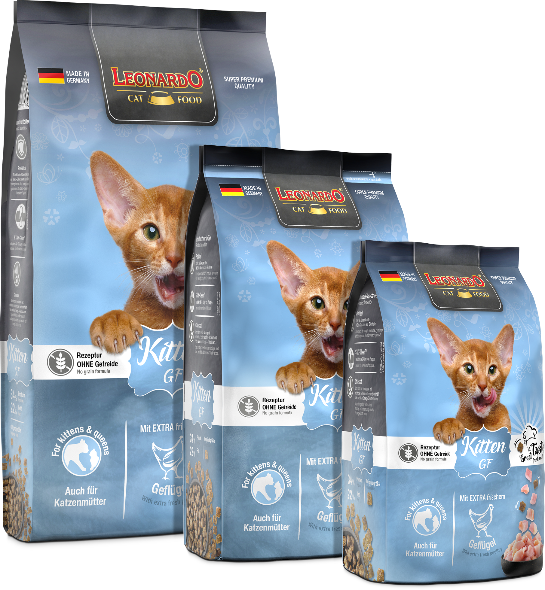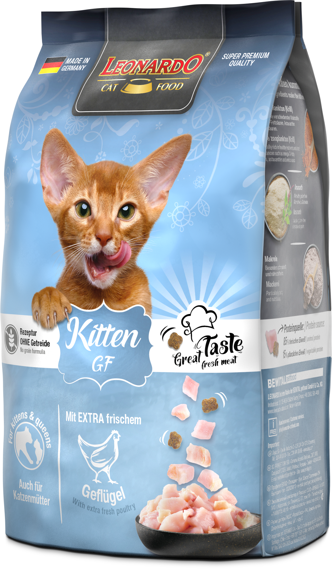 A la hora de elegir el alimento para su gatito muchos propietarios prefieren una receta sin cereales. Por eso para el LEONARDO Kitten GF apostamos por el amaranto como valiosa alternativa sin gluten. Con deliciosa caballa y carne de ave extra fresca que les encanta a los más pequeños. La receta se complementa con otros selectos ingredientes: zooplancton marino y semillas de chÃa. Ambos son fuentes naturales de sustancias vitales como los ácidos grasos omega-3. Nuestros componentes vitales además aseguran un inicio óptimo de la vida del gatito: STAY-Cleanâ„¢* refuerza el cuidado dental y ProVital fortalece el sistema inmunológico. *STAY-Cleanâ„¢ es una marca registrada de DSM Nutritional Products AG.