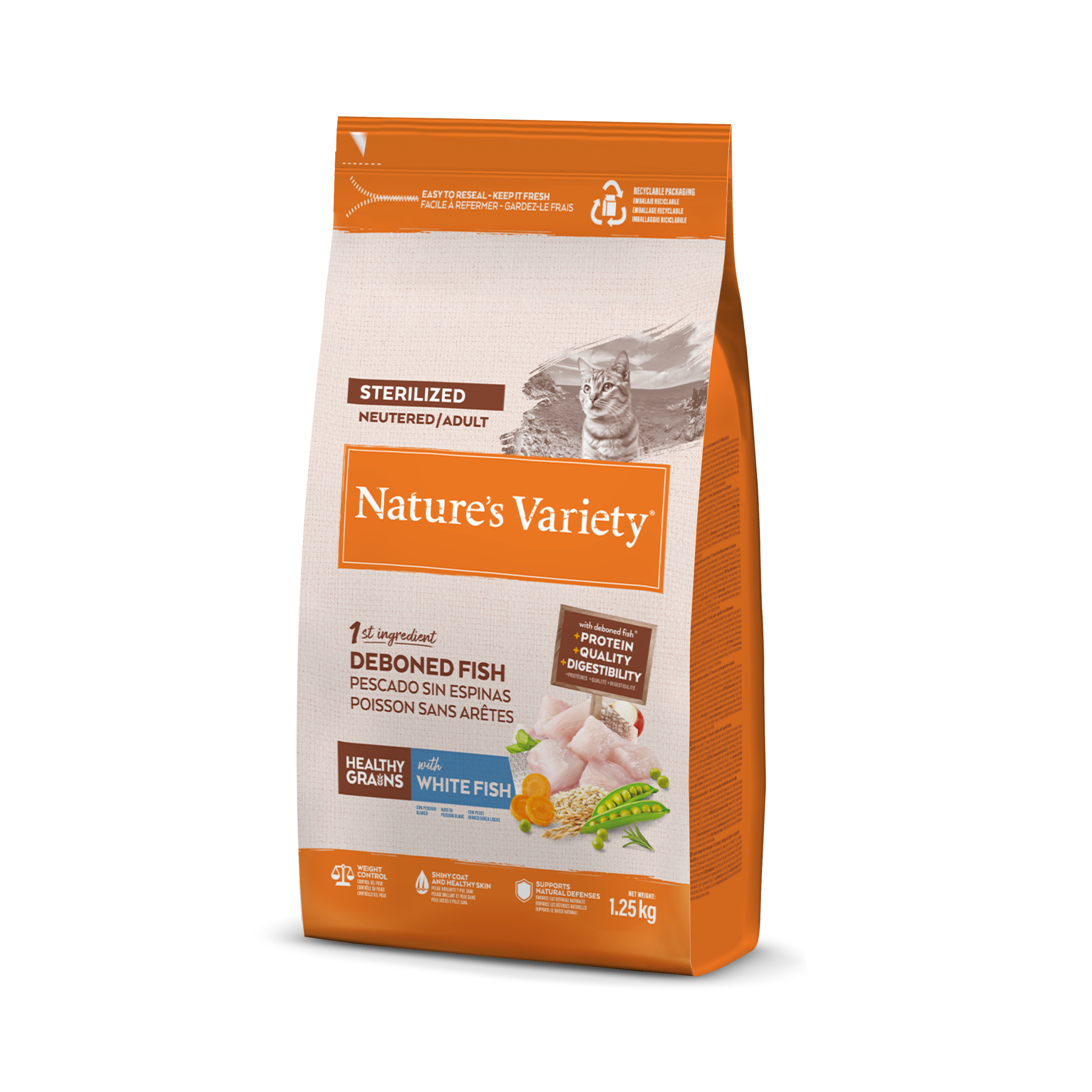 Alimento completo y equilibrado para gatos adultos esterilizados. Elaborado con pescado blanco como principal ingrediente. Complementado con frutas y verduras cuidadosamente seleccionadas y cereales saludables.