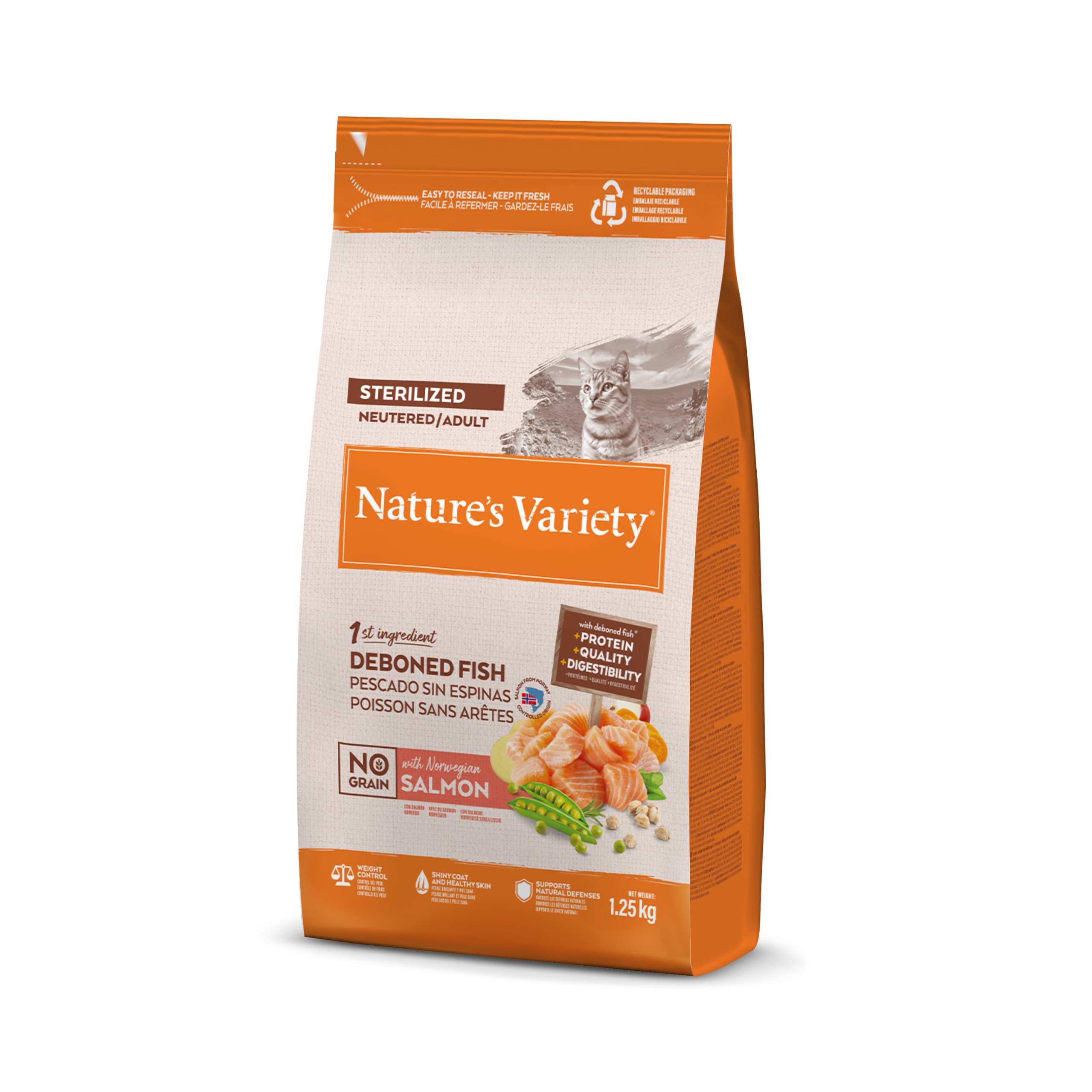 Alimento completo y equilibrado para gatos adultos esterilizados, sin cereales. Elaborado con Salmón Noruego sin espinas como principal ingrediente. Complementado con frutas, verduras, superalimentos y fuentes naturales de carbohidratos alternativos.
