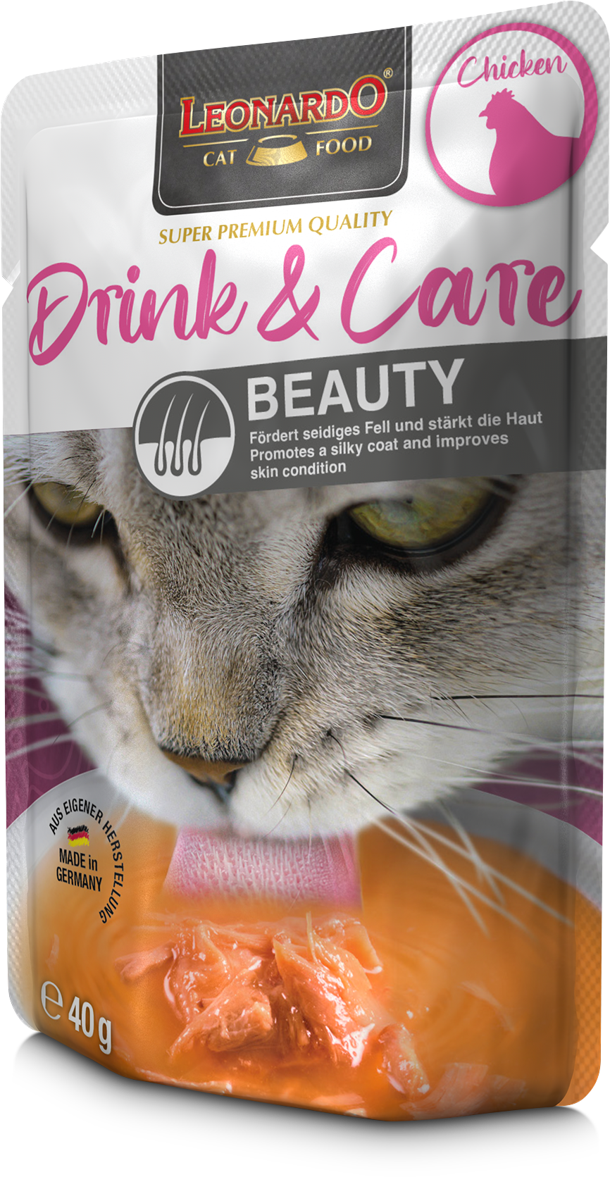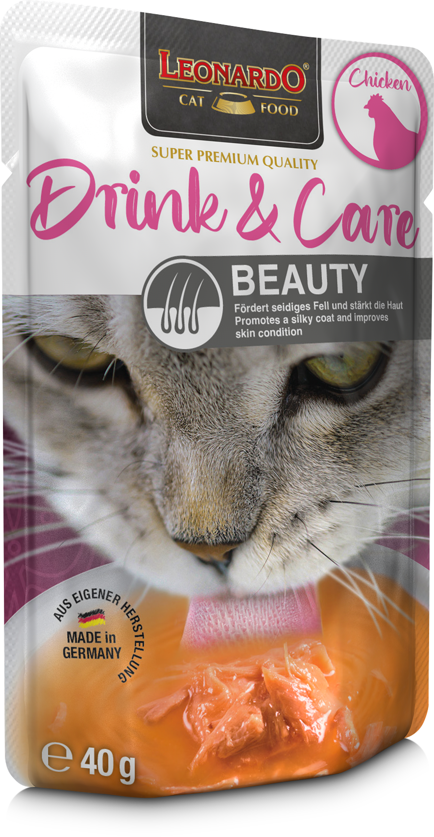 LEONARDO Drink & Care Beauty Chicken es un alimento complementario para gatos que favorece la ingesta de líquidos, consigue un pelaje sedoso y fortalece la piel con ácidos grasos omega 3 de alta disponibilidad.