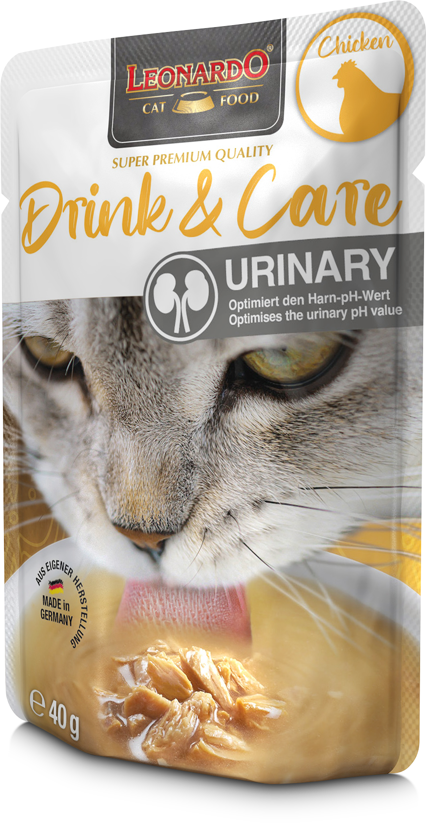 LEONARDO Drink & Care Urinary Chicken es un alimento complementario para gatos para promover la ingesta de líquidos y estabilizar el pH de la orina.