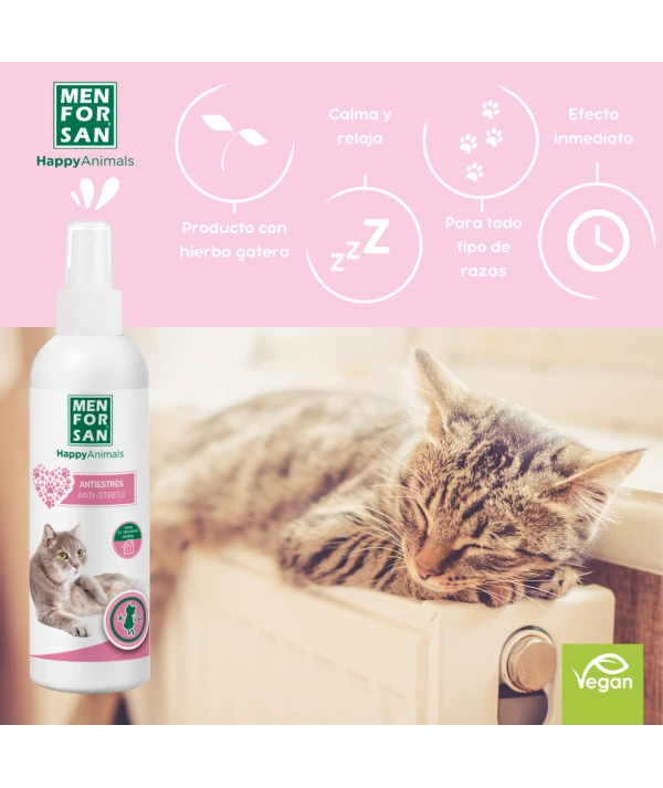 El AntiestrĂ©s para gatos contiene hierba gatera, atrayente natural muy atractivo que disminuye y reduce los signos de estrĂ©s y ansiedad ocasionados por separaciĂ³n, demasiado tiempo solo en casa, periodo de celo, fuegos artificiales, viajes, nueva mascota en casa, nuevo hogar, cambios en el hogar, ruidos fuertes, visita al veterinario, perdida de compañero, viajes en coche, enfermedad.