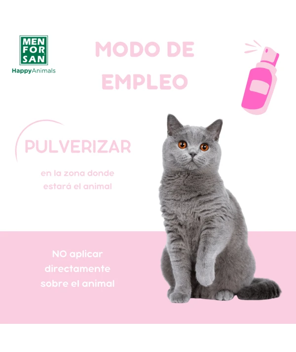 El producto se pulveriza en las Ă¡reas de descanso, juguetes, rascadores, trasportines, etc. Conseguiremos que el gato se concentre en estos elementos contribuyendo a reducir los sĂntomas de estrĂ©s (cambios de comportamiento, exceso de aseo personal, pĂ©rdida de apetito, exceso de rascado, agresiĂ³n, letargo, exceso de maullidos, etc.).
