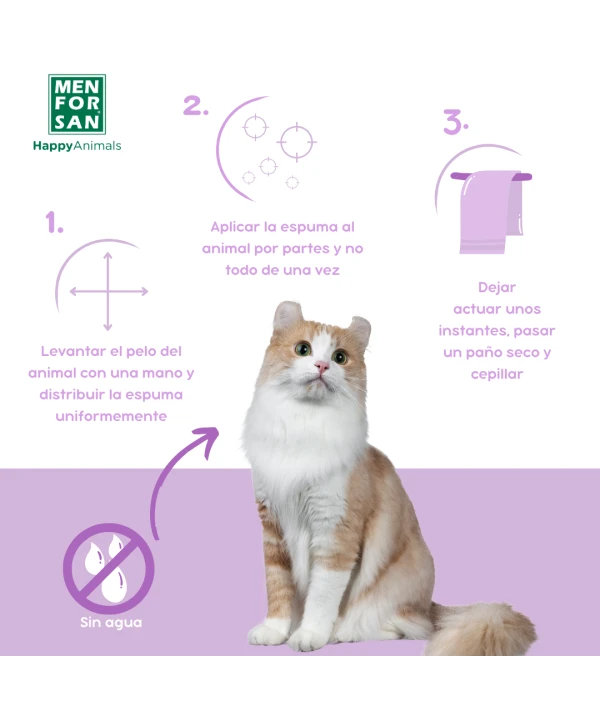 Limpia y actĂșa en cualquier parte del cuerpo y del pelaje de gatos sin utilizaciĂłn de agua. La espuma contiene 3 activos naturales, MARGOSA, GERANIOL y LAVANDINO que funcionan como repelentes de infestaciones de todo tipo de insectos parĂĄsitos y voladores (pulgas, garrapatas, chinches, ĂĄcaros y mosquitos).