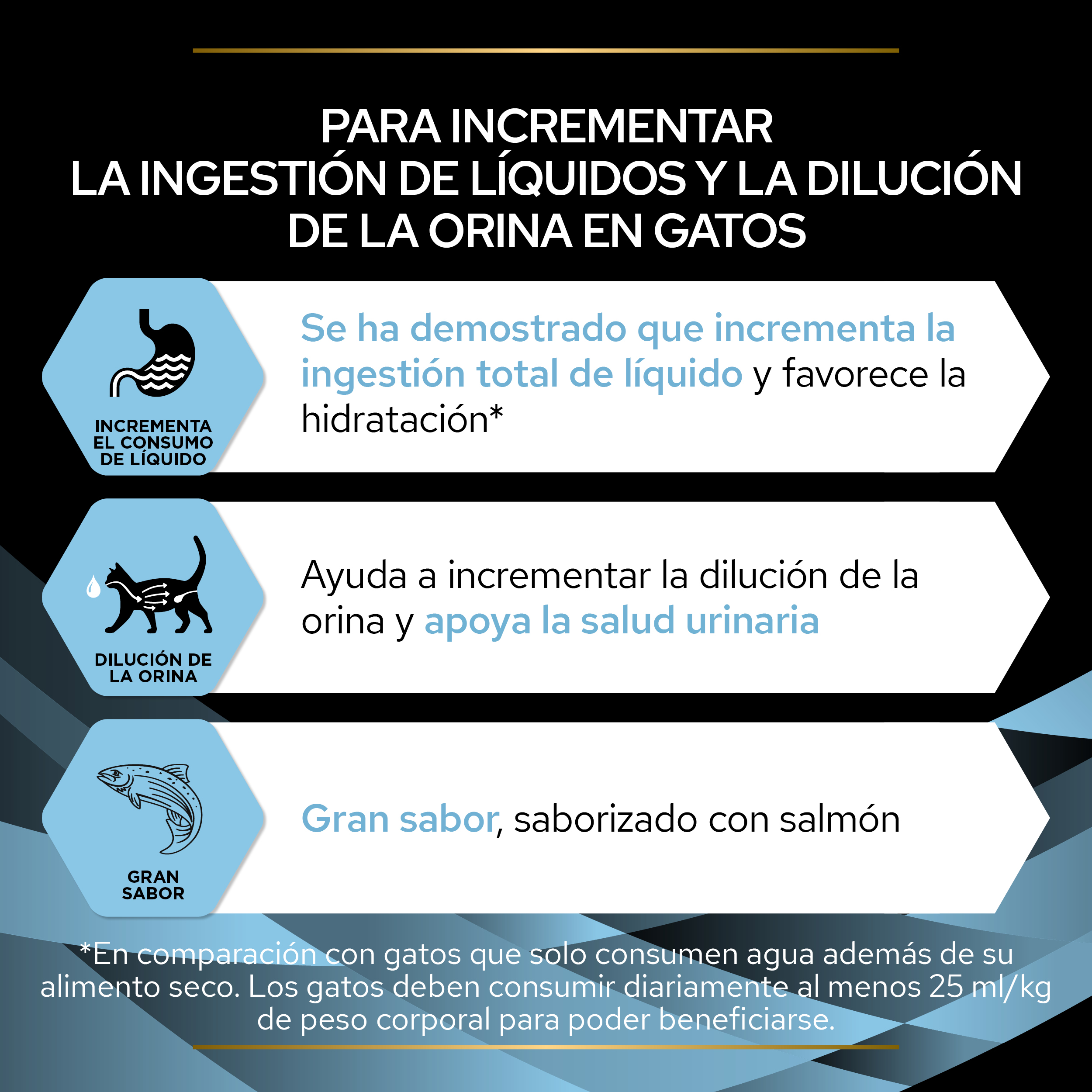 *En comparación con gatos que solo consumen agua además de su alimento seco. Los gatos deben consumir diariamente al menos 25 ml/kg de peso corporal para poder beneficiarse.