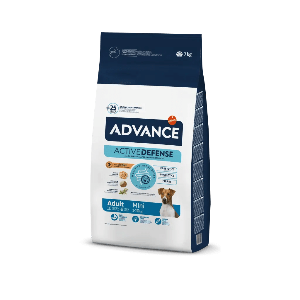 Advance Adult Mini es un alimento de alta calidad, fácil de digerir y formulado para cubrir las necesidades de los perros adultos de tamaño pequeño. Está elaborado con pollo como primer ingrediente. Ayuda a mantener la masa muscular gracias a su nivel de proteina de alta calidad y contribuye a una piel saludable y un pelo brillante gracias a los ácidos grasos omega 6 y 3.El tamaño de su croqueta se adapta a la mandíbula de los perros de tamaño pequeño.