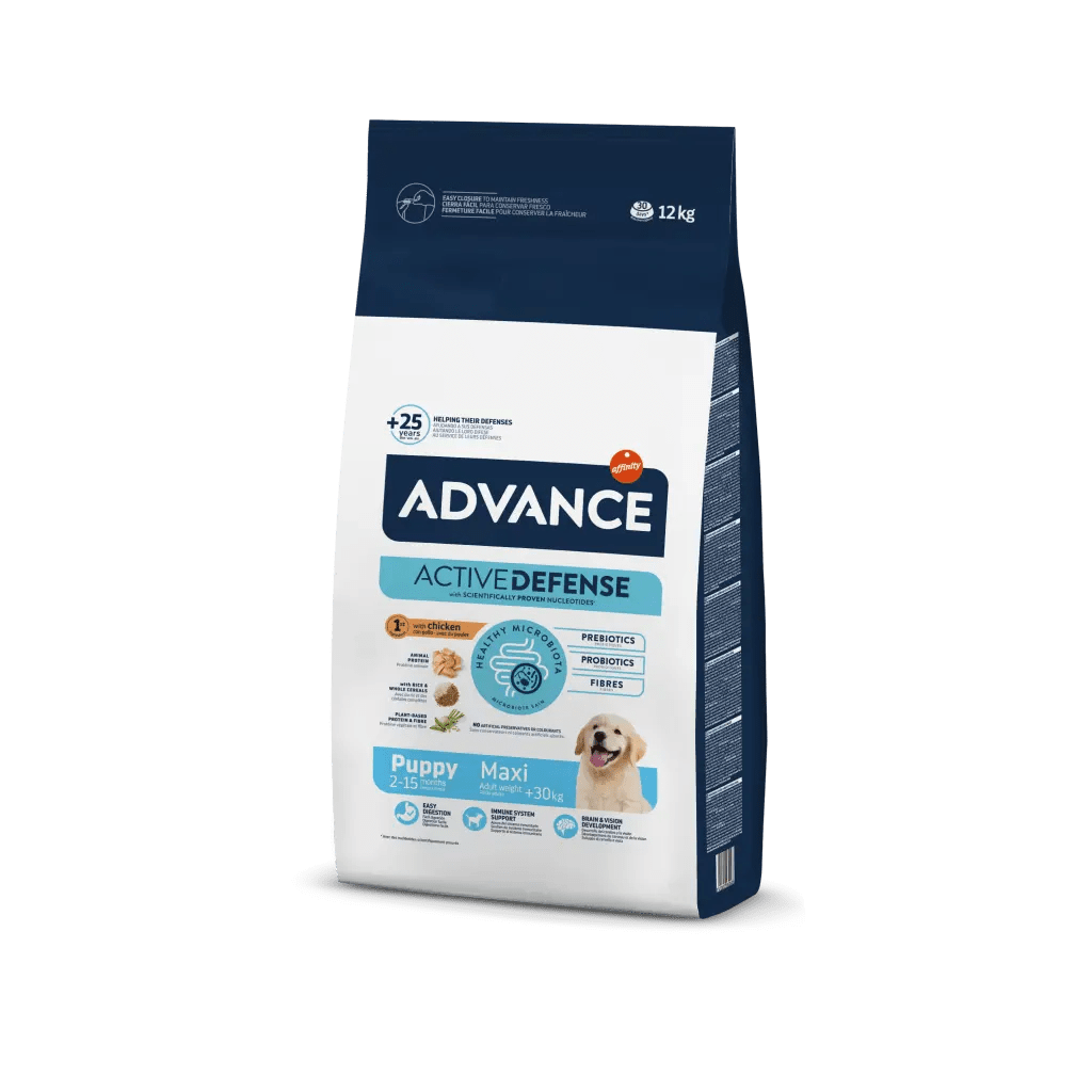 Advance Puppy Maxi está especÃficamente formulado para cubrir las necesidades nutricionales de los cachorros. Es un alimento fácil de digerir que contribuye al normal desarrollo del cerebro y la visión y al óptimo crecimiento de los huesos, gracias a los ácidos grasos omega-3, vitaminas y minerales. Incorpora nucleótidos que ayudan a mantener la respuesta inmunológica natural. El tamaño reducido de su croqueta se adapta a la mandibula de los cachorros de tamaño grande.