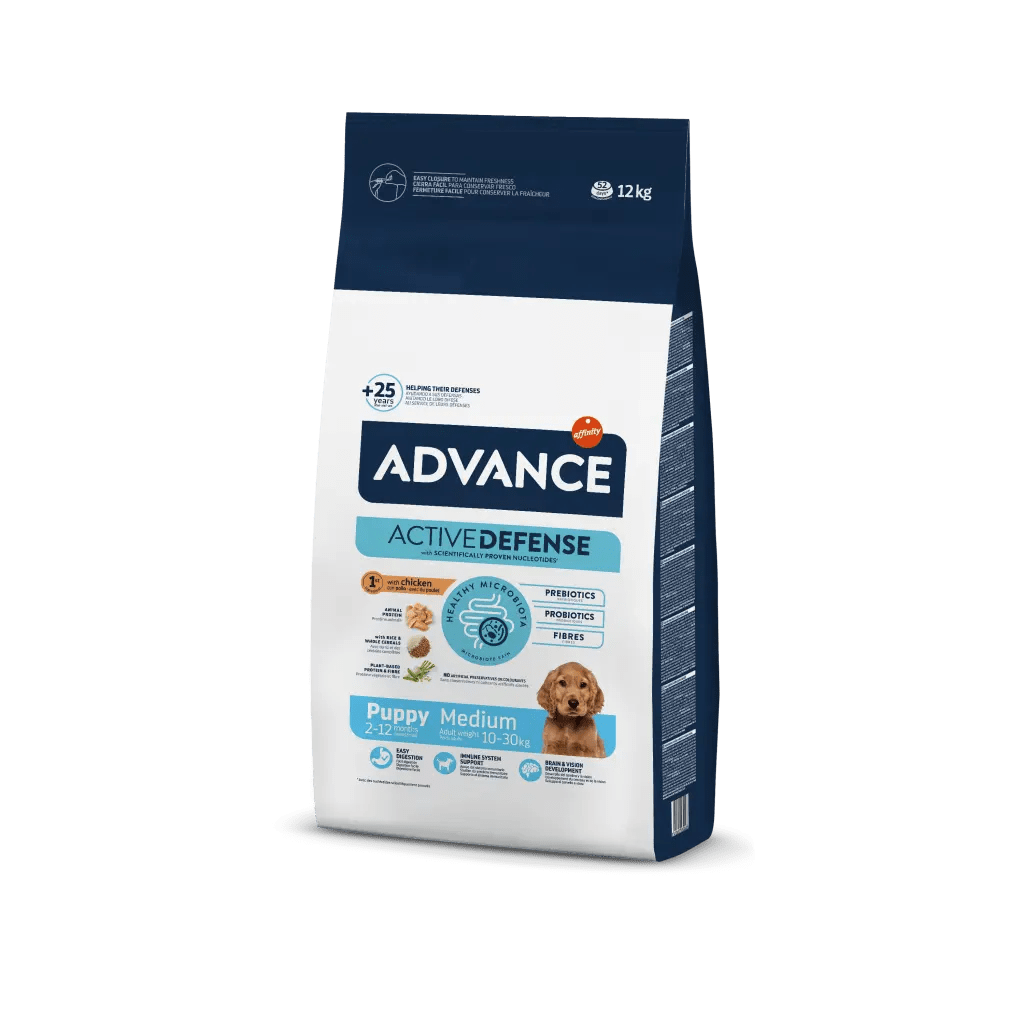 Advance Puppy Medium está especÃficamente formulado para cubrir las necesidades nutricionales de los cachorros. Es un alimento fácil de digerir que contribuye al normal desarrollo del cerebro y la visión y al óptimo crecimiento de los huesos, gracias a los ácidos grasos omega-3, vitaminas y minerales. Incorpora nucleótidos que ayudan a mantener la respuesta inmunológica natural. El tamaño reducido de su croqueta se adapta a la mandÃbula de los cachorros de tamaño mediano.