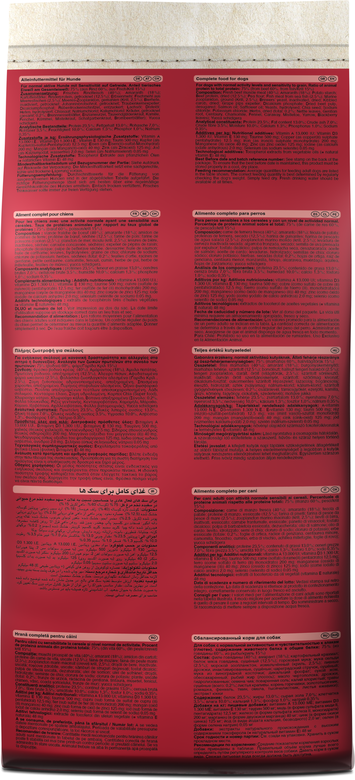 COMPOSICIÓN: Carne de ternera fresca (40 %); amaranto (18 %); fécula de patata; proteínas de ternera*¹ (12,5 %); harina de guisantes; harina de pescado de agua salada (2,5 %); zooplancton marino (krill)*² (2,5 %); levadura de cerveza inactivada*¹; algarroba tronzada*¹; semilla de uva prensada por expulsor; fosfato dicálcico; pulpa de remolacha seca*³; aceite de salmón; aceite de cártamo; levaduras*⁴; semillas de chía; cloruro sódico; cloruro potásico; hierbas*¹ (hojas de ortiga, raíz de genciana, centaura menor, manzanilla, hinojo, alcaravea, muérdago, aquilea, hojas de zarzamora) (0,2 %); yucca schidigera *¹secado *²molido *³desazucarado *⁴hidrolizado.