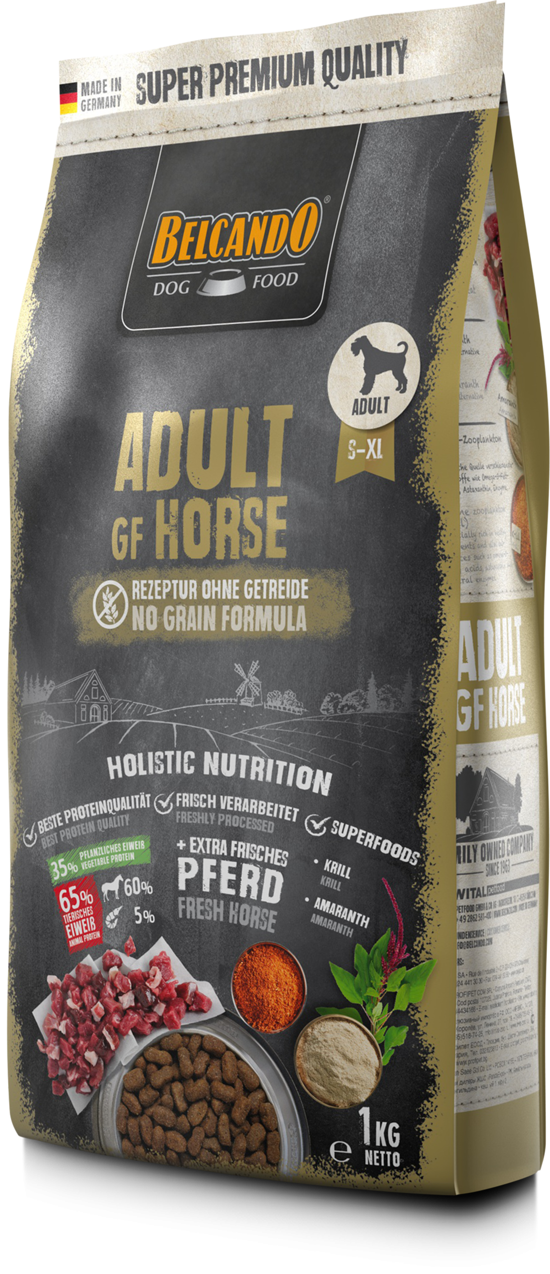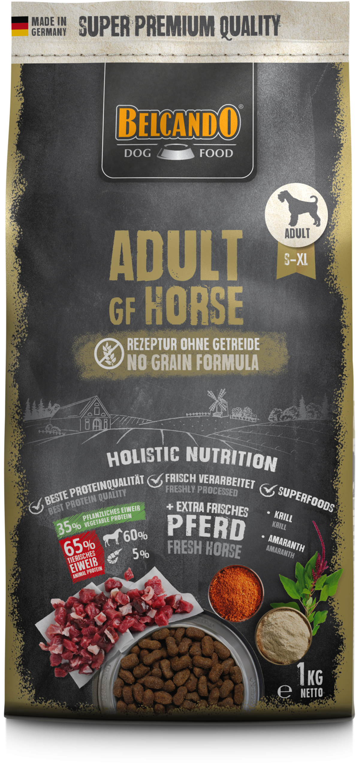 Composición: Carne fresca de caballo, corazón, hígado, pulmón (40 %); harina de guisantes; fécula de patata; proteína de caballo*¹ (12 %); amaranto (5 %); harina de habas (Vicia faba); pulpa de remolacha seca*²; zooplancton marino (krill) (2,5 %); levadura de cerveza inactivada*¹; algarroba tronzada*¹; proteína de guisantes; aceite de salmón; levaduras*³; semillas de chía; aceite de cártamo (1 %); cloruro potásico; cloruro sódico; hierbas*¹ (hojas de ortiga, raíz de genciana, centaura menor, manzanilla, hinojo, alcaravea, muérdago, aquilea, hojas de zarzamora) (0,2 %) *¹secado *²desazucarado *³hidrolizado