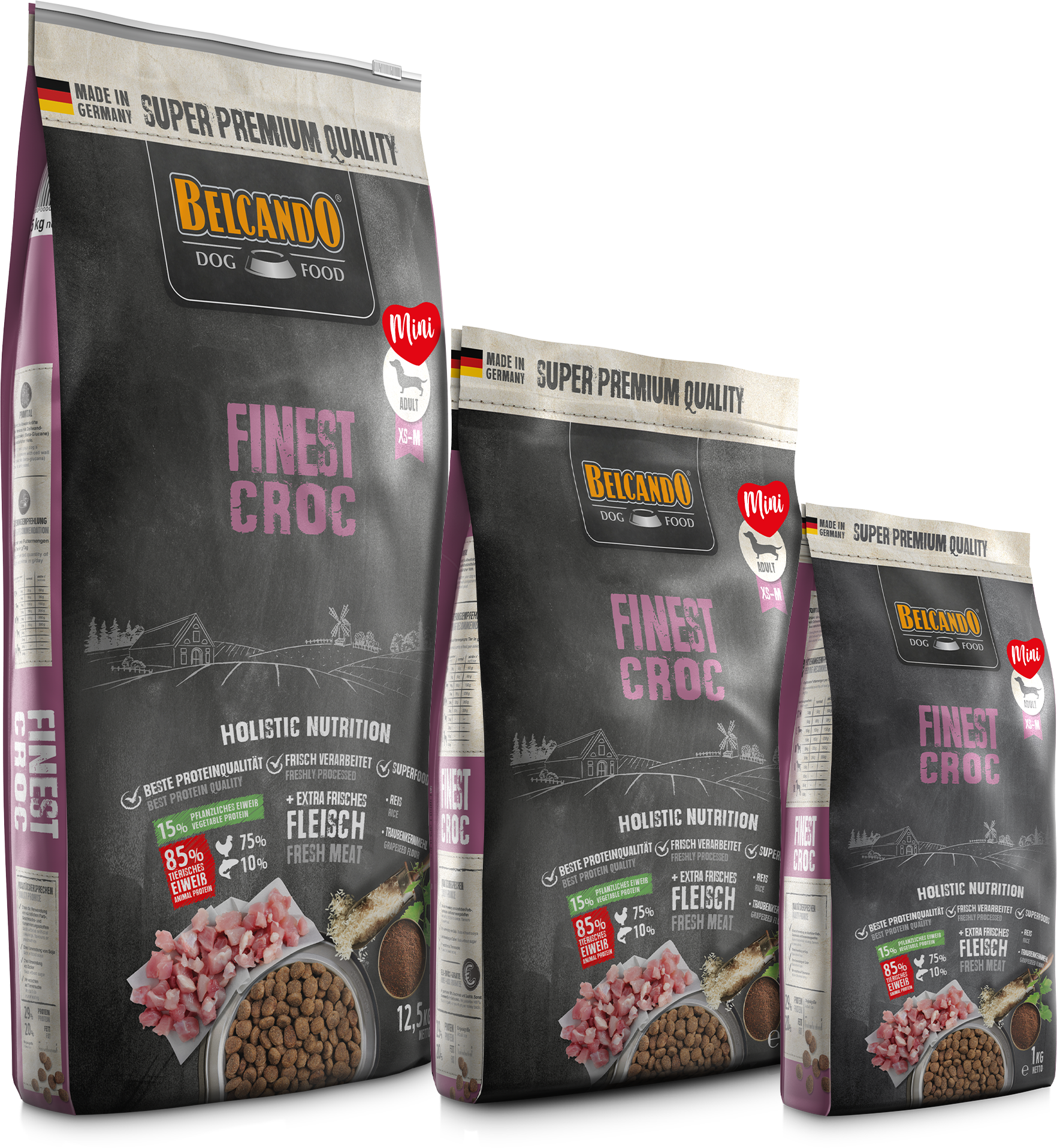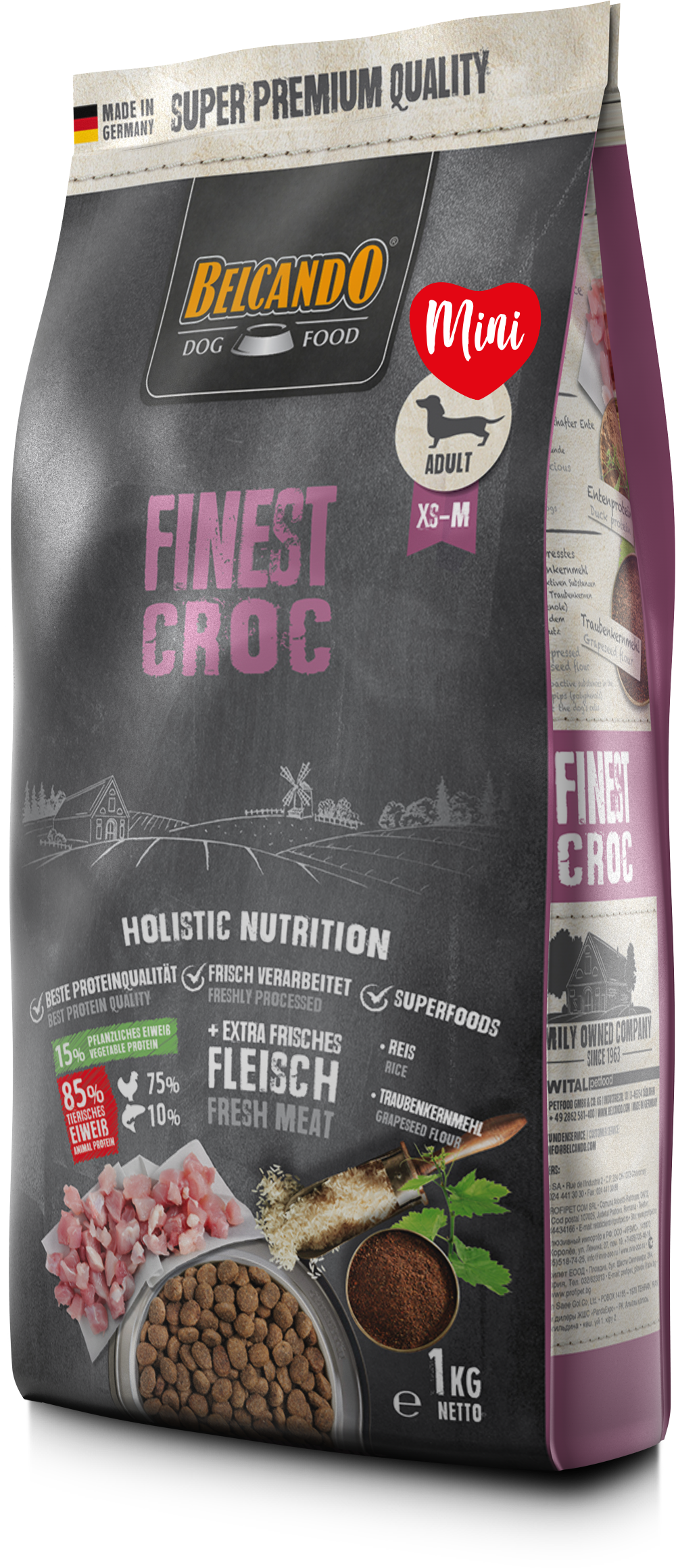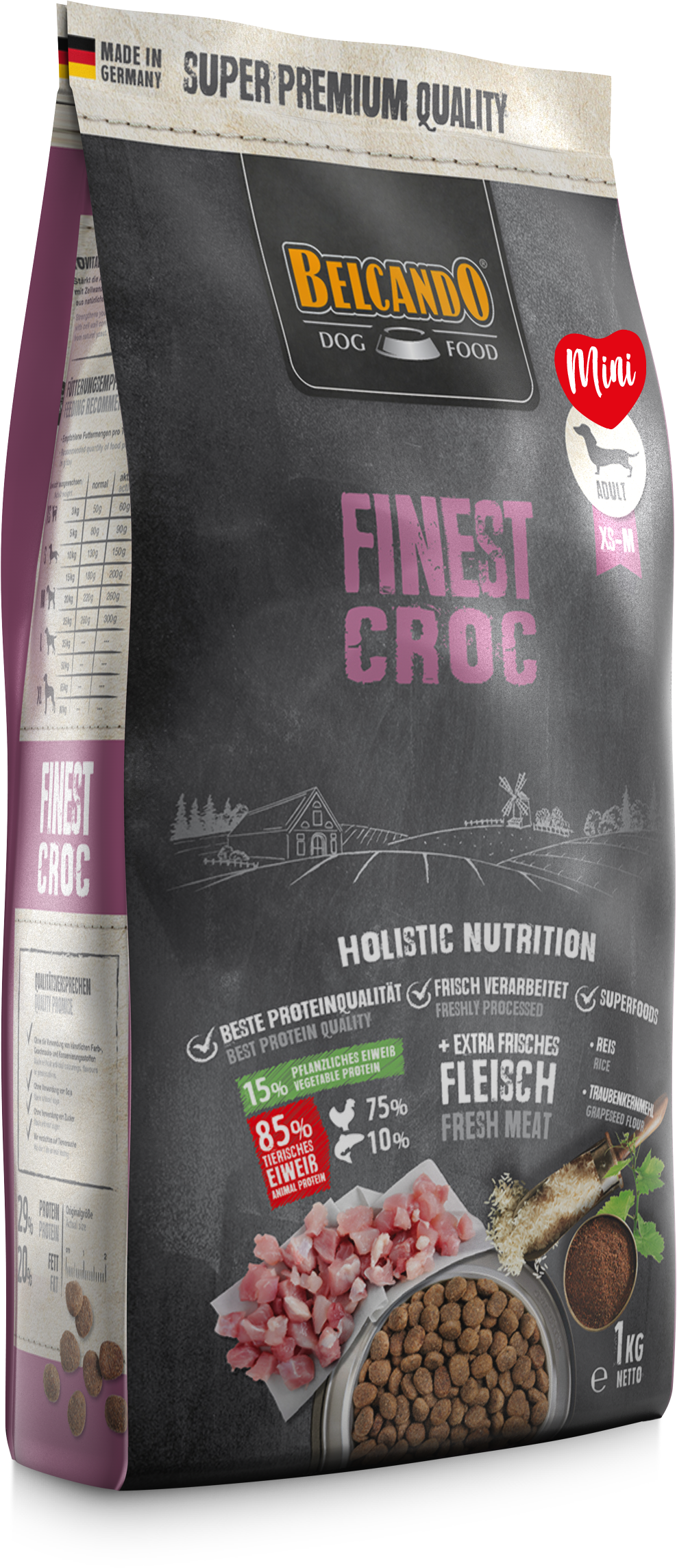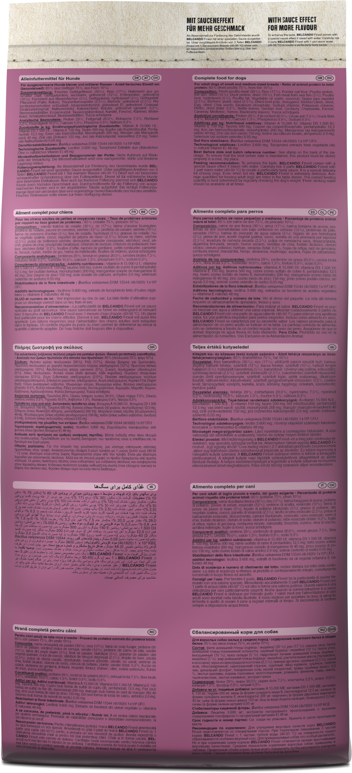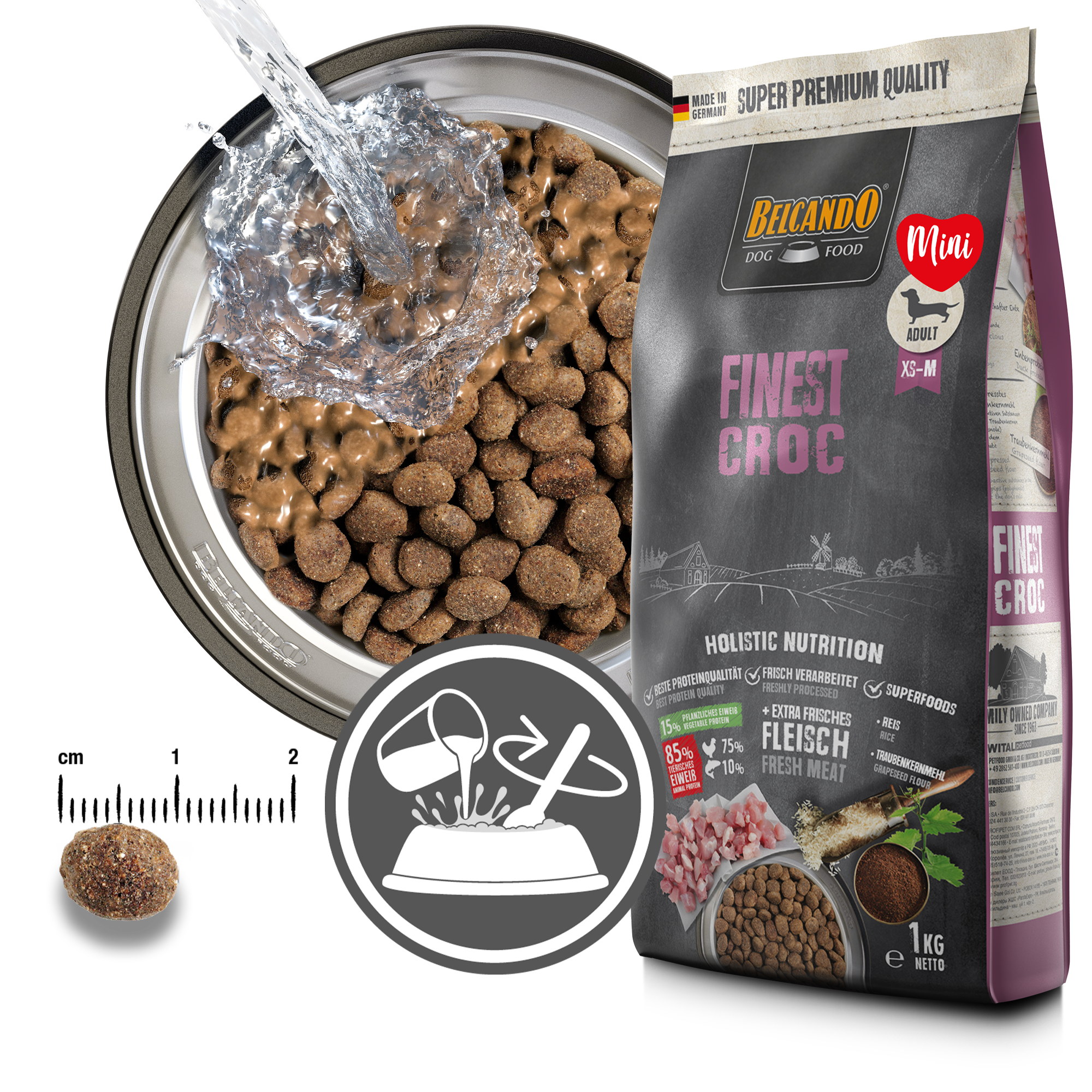 Materias primas especialmente seleccionadas, el sabroso pato y el hÃgado hacen de BELCANDO Finest Croc la primera opción para perros adultos de paladares exquisitos. El arroz, de muy fácil digestión, y la valiosa harina de semilla de uva prensada en frÃo hacen que la hora de comida sea un placer muy saludable en todos los sentidos. Un alto contenido en proteÃnas y grasas favorece la digestión y reduce el volumen fecal. Salsa : cuando se mezcla con agua caliente, se forma una salsa sabrosa.