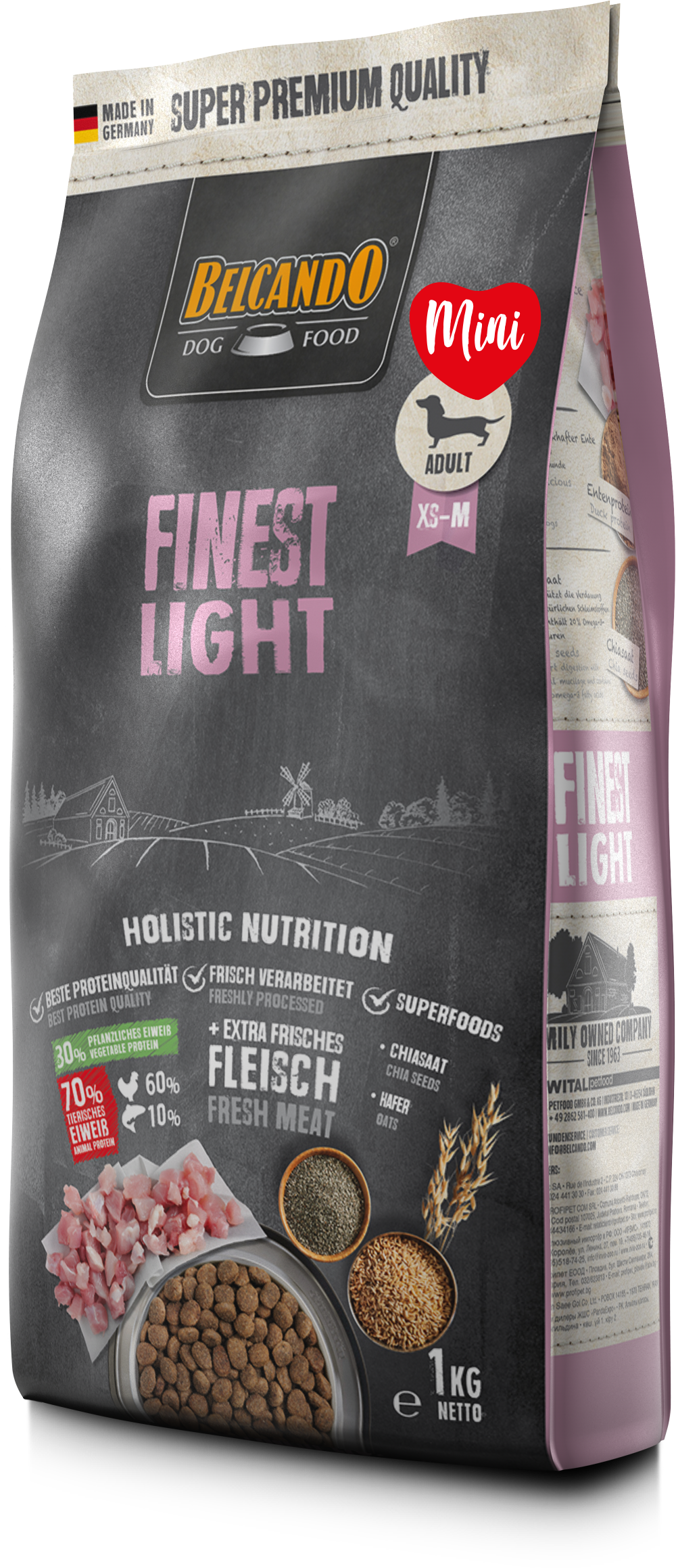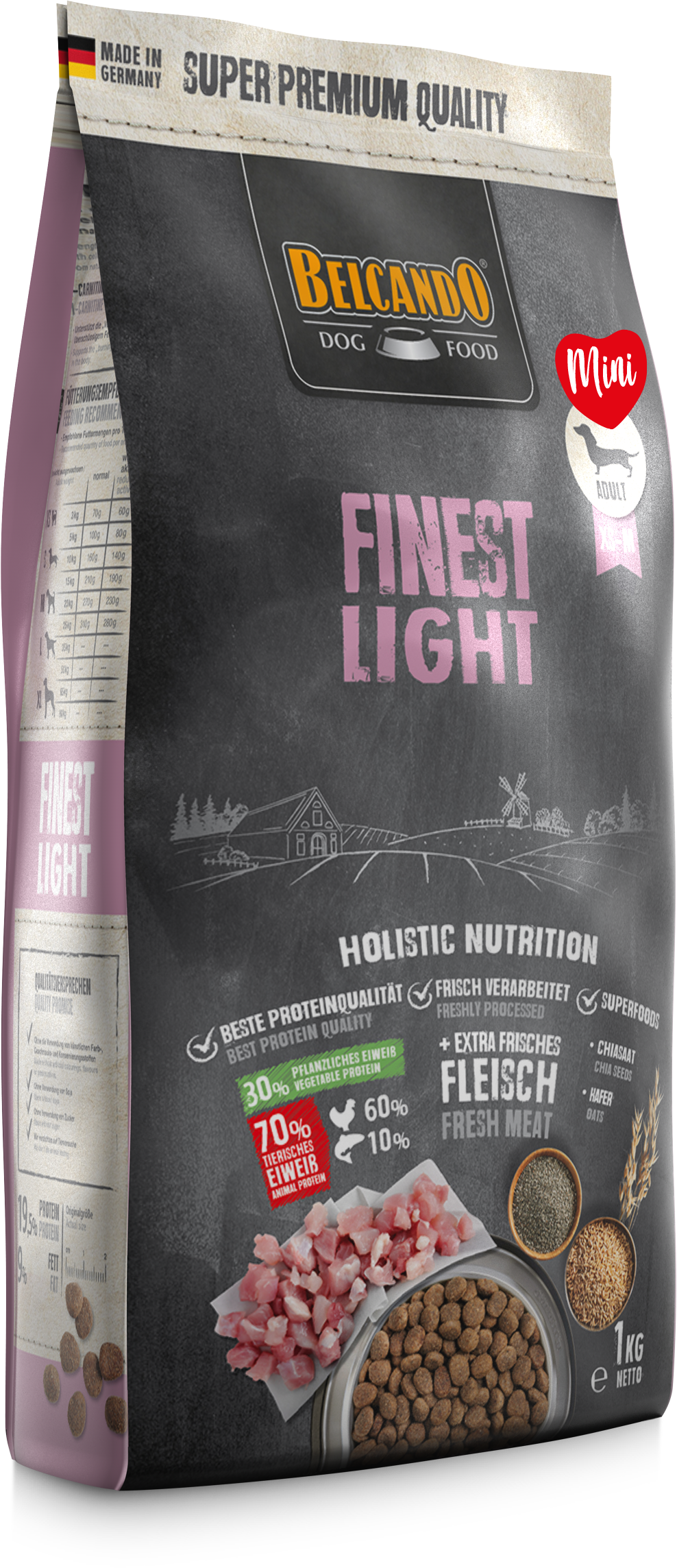 Sabroso, saciante y saludable gracias a selectas materias primas. El delicioso pato y el hÃgado estimulan el apetito del perro. La abundante avena produce una sensación de saciedad y es rica en ácidos grasos esenciales como las semillas de chÃa, que ayudan en la digestión. El bajo contenido en proteÃnas y grasas de BELCANDO Finest Light hace de esta alimentación la opción ideal para perros de edad avanzada con bajos niveles de actividad. Un contenido especialmente alto en fibra hace más fácil controlar o reducir el peso del animal a la vez que proporciona sensación de saciedad. El menor contenido en fósforo y sodio evita trabajo a los riñones. Salsa : cuando se mezcla con agua caliente, se forma una salsa sabrosa.