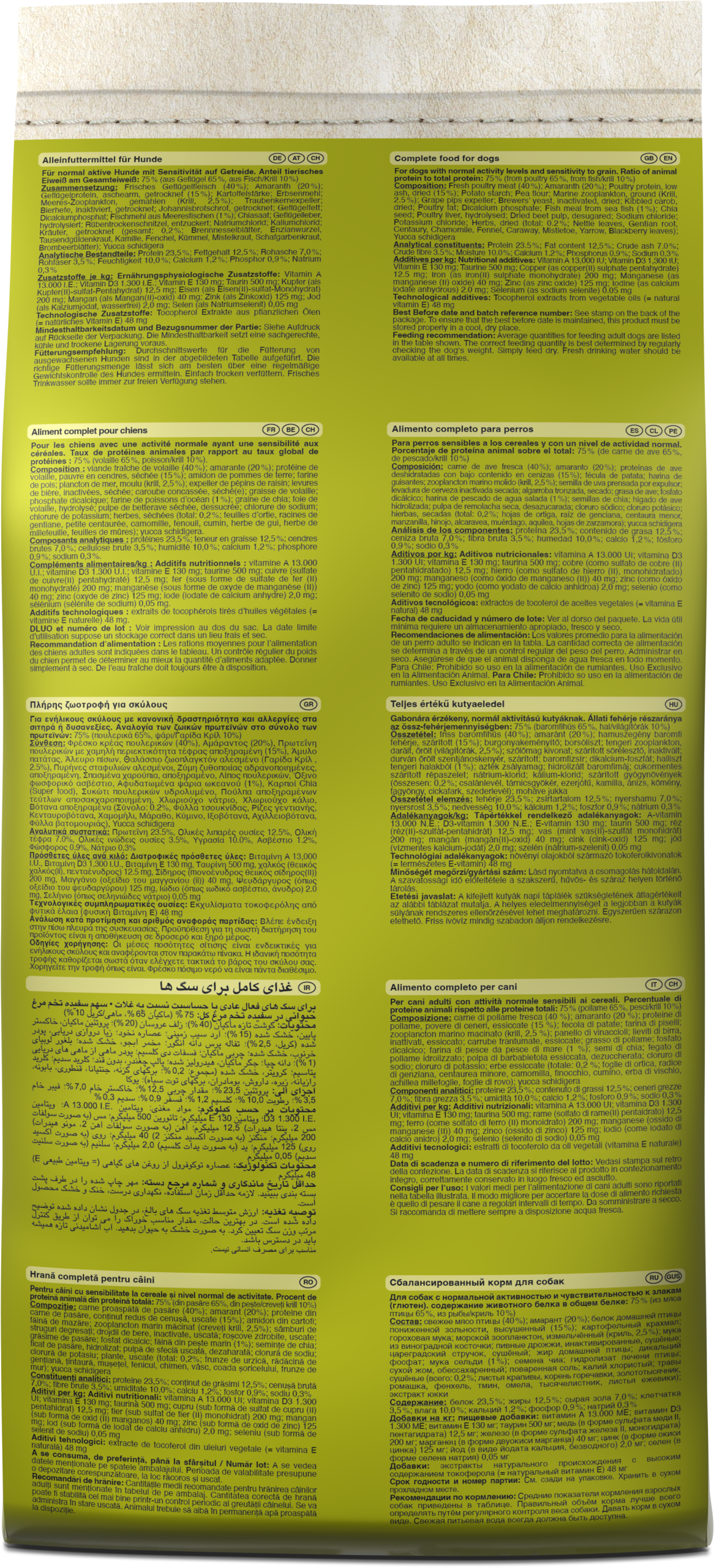Composición: Carne de ave fresca (40 %); amaranto (20 %); proteÃna de ave con bajo contenido en ceniza*¹ (15 %); fécula de patata; harina de guisantes; zooplancton marino (krill) (2,5 %); semilla de uva prensada por expulsor; levadura de cerveza inactivada*¹; algarroba tronzada*¹; grasa de ave; fosfato dicálcico; harina de pescado de agua salada (1 %); semillas de chÃa; hÃgado de ave*²; pulpa de remolacha seca*³; cloruro sódico; cloruro potásico; hierbas*¹ (hojas de ortiga, raÃz de genciana, centaura menor, manzanilla, hinojo, alcaravea, muérdago, aquilea, hojas de zarzamora) (0,2 %); yucca schidigera *¹secado *²hidrolizado *³desazucarado.