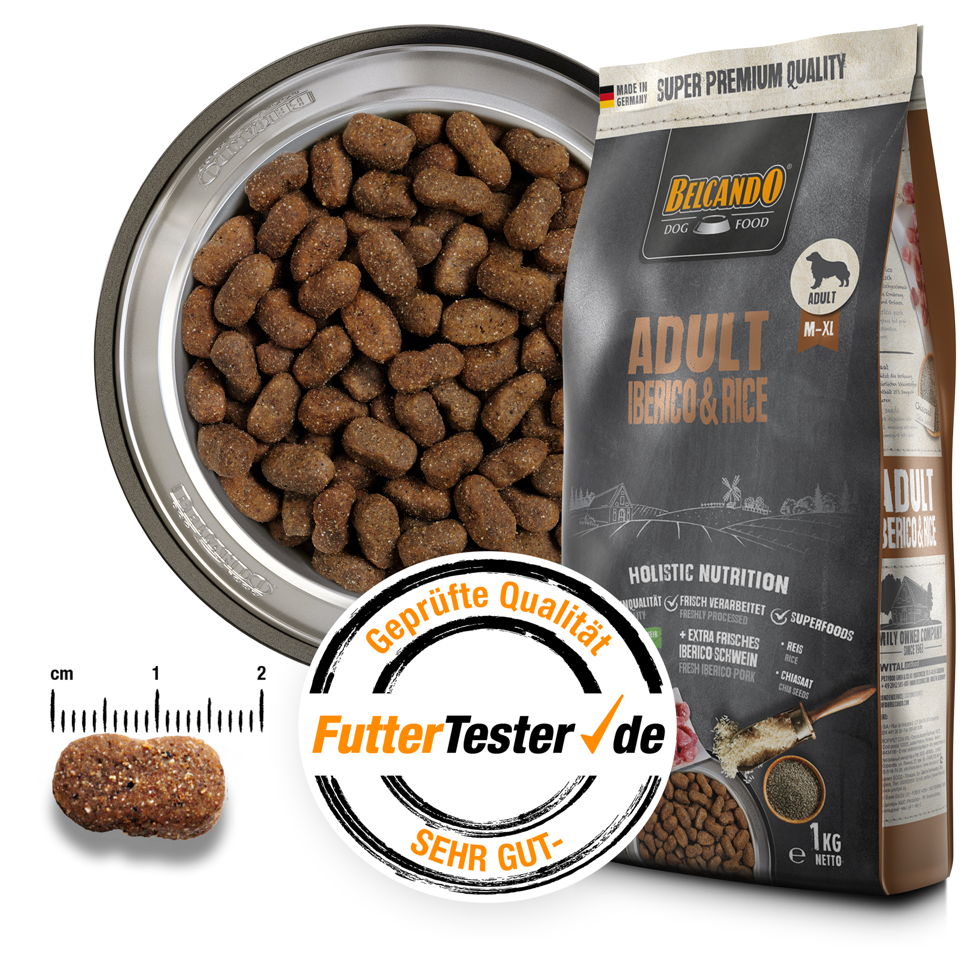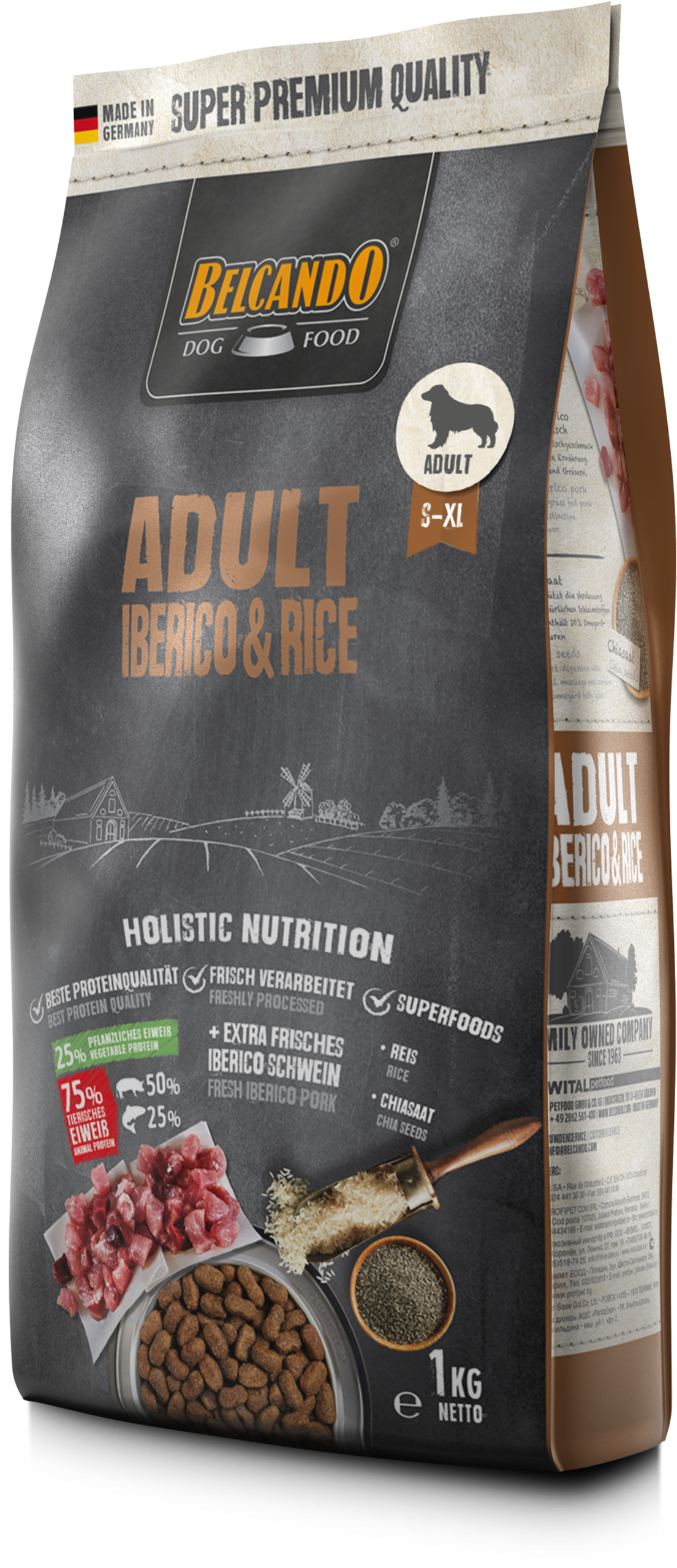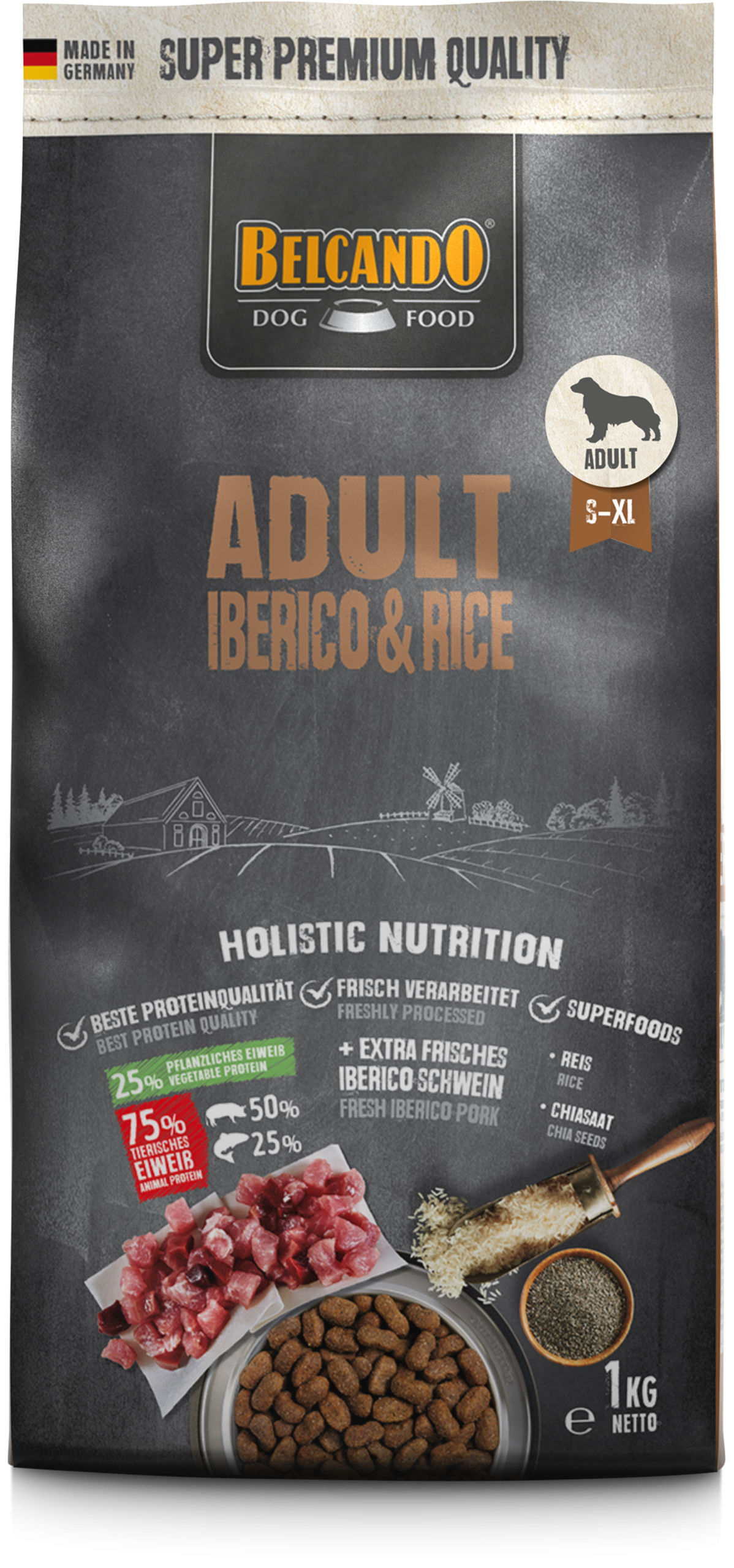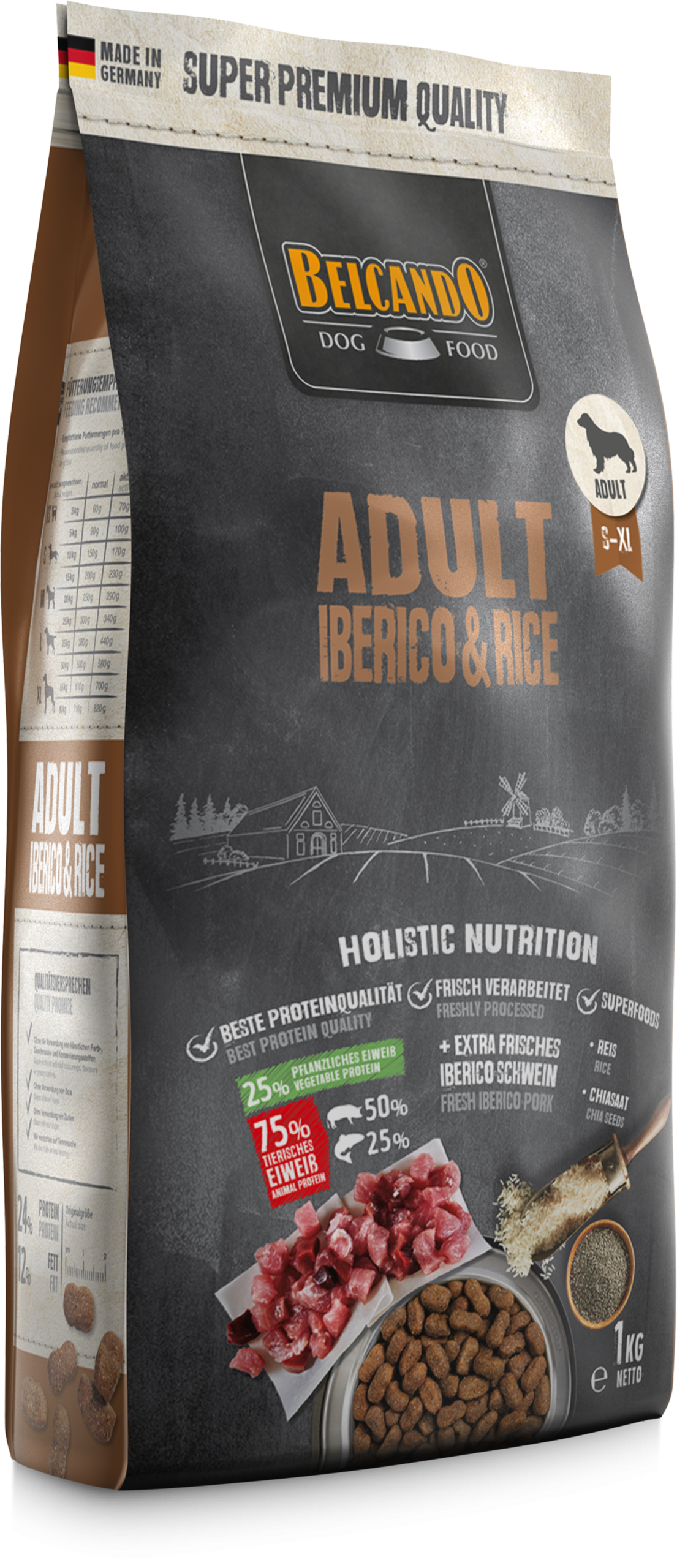La combinación de carne fresca de cerdo ibérico y arroz de digestión fácil hace de esta receta una autentica experiencia de sabor. Lo especial: los cerdos de pata negra viven semisalvajes en las dehesas del sur y sur-oeste de la penÃnsula. Gracias al ejercicio que hacen buscando alimentos, engordan relativamente lento. Eso y la alimentación especial en si, a base de bellotas, setas, raÃzes y otros frutos silvestres, crea el sabor tan único del cerdo iberico. BELCANDO Adult Iberico & Rice se completa con ingredientes valiosos y superfoods como semillas de chÃa con sustancias mucilaginosas naturales y un 20% de Omega 3. Gracias a esto la variedad está perfectamente adaptada a las necesidades de perros adultos.