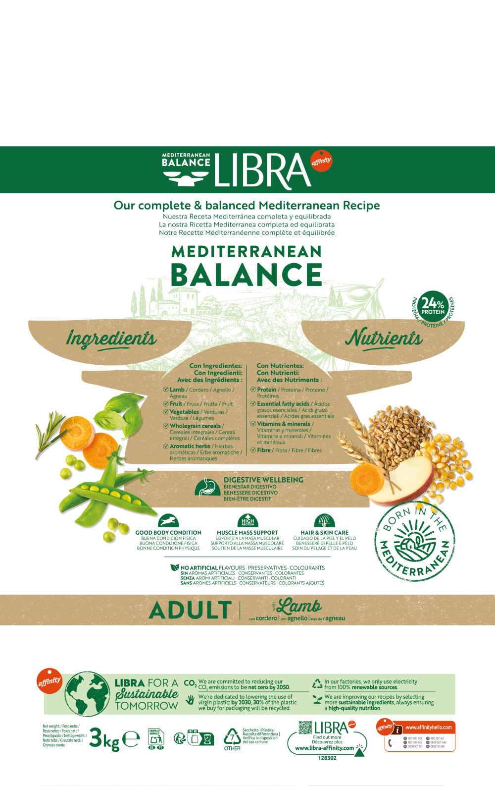 Nuestra receta mediterránea con Cordero, que contiene una proporción correcta de nutrientes esenciales e ingredientes de calidad como fruta, verduras, cereales integrales y hierbas aromáticas, ofreciendo una alimentación completa y equilibrada a tu perro.
