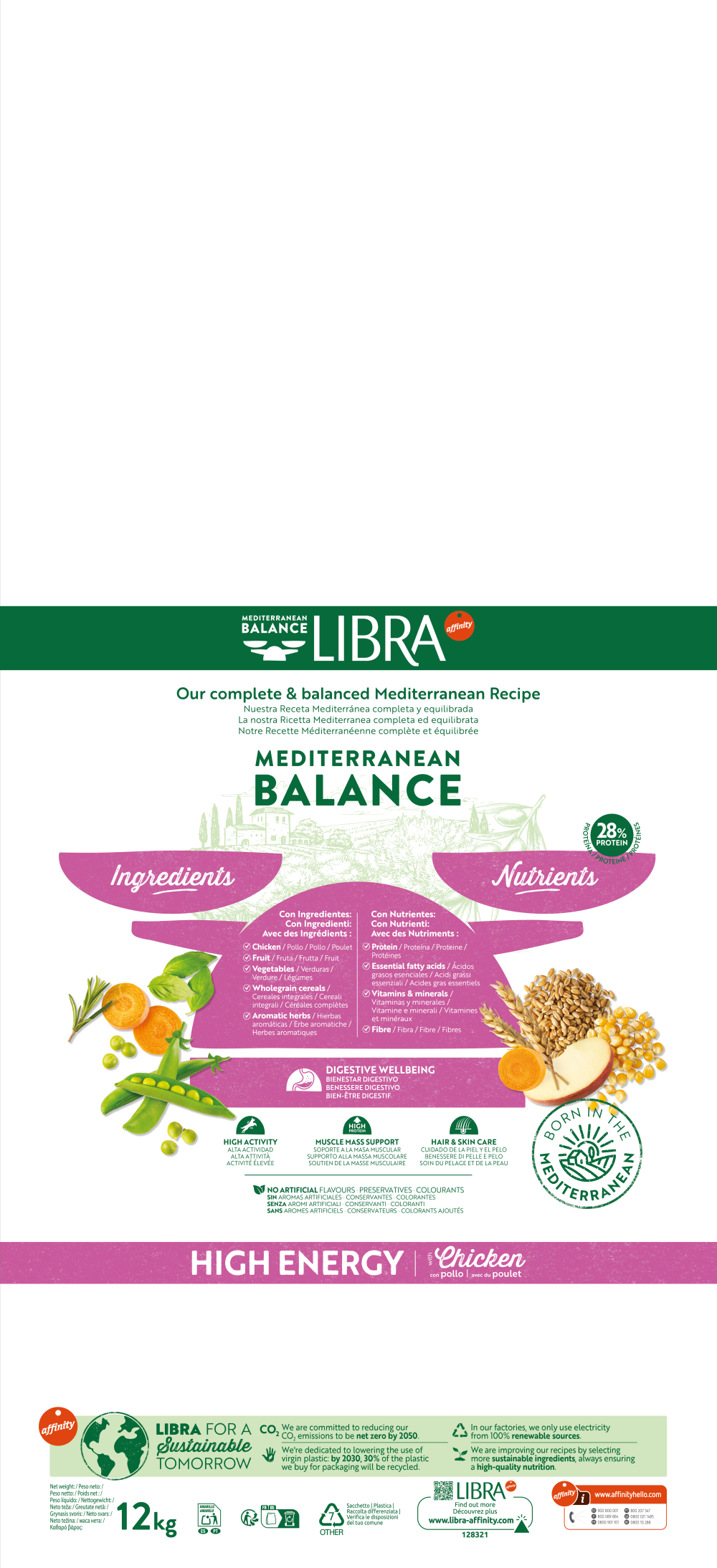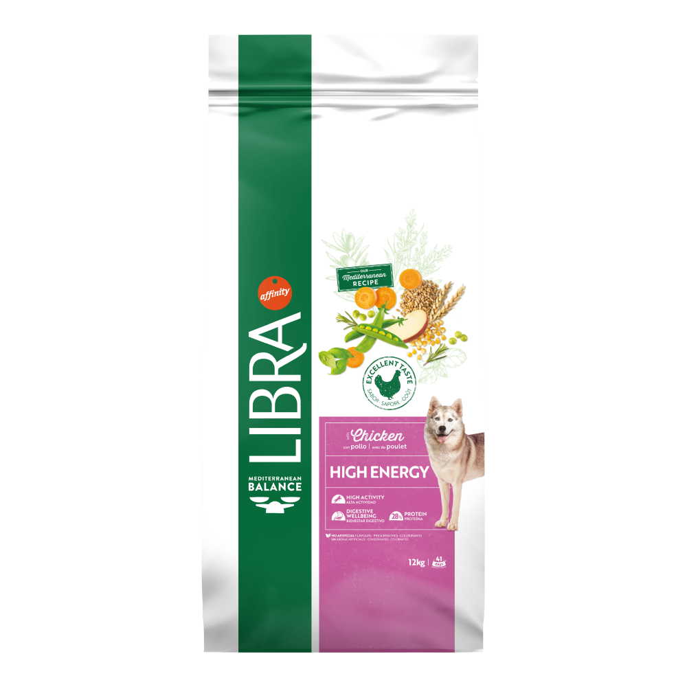 Nuestra receta mediterránea con Pollo, que contiene una proporción correcta de nutrientes esenciales e ingredientes de calidad como fruta, verduras, cereales integrales y hierbas aromáticas, ofreciendo una alimentación completa y equilibrada a tu perro con alta actividad.
