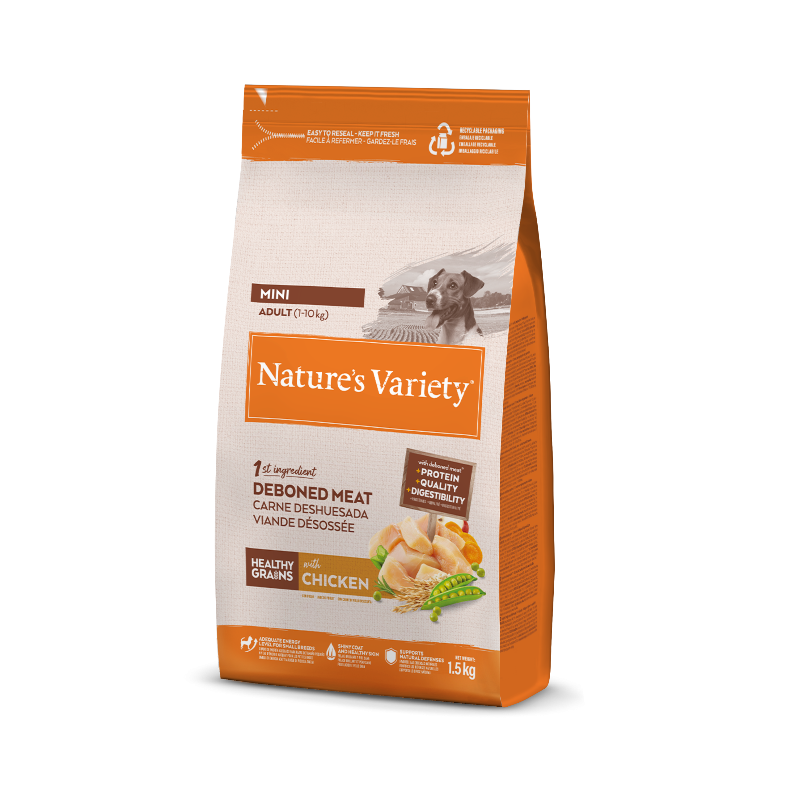 Alimento completo y equilibrado para perros adultos de pequeño tamaño. Elaborado con carne de pollo campero deshuesada como principal ingrediente. Complementado con frutas y verduras cuidadosamente seleccionadas y cereales saludables.