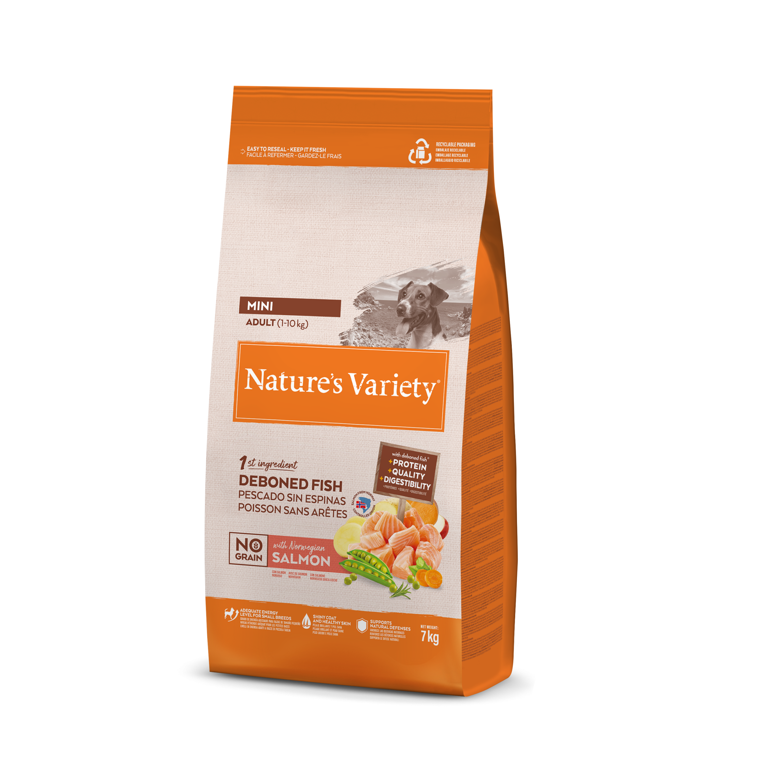 Alimento completo y equilibrado para perros adultos de pequeño tamaño, sin cereales. Elaborado con Salmón Noruego sin espinas como principal ingrediente. Complementado con frutas, verduras, superalimentos y fuentes naturales de carbohidratos alternativos.