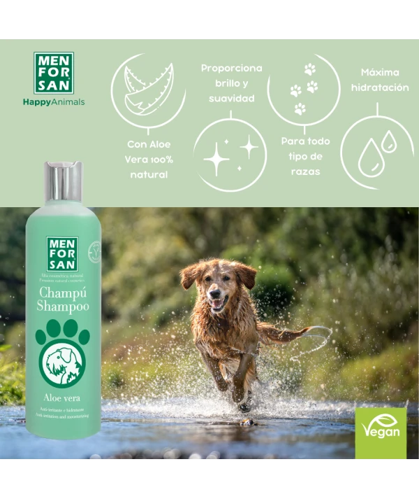 ChampĂș de mĂĄxima calidad para perros con ALOE VERA 100% natural de cultivo ecolĂłgico indicado para pieles con irritaciones, picaduras de insectos, erupciones y eczemas Proporciona brillo y suavidad, hidrata en profundidad y es muy Ăștil para reparar pelajes estropeados Apto para uso frecuente en todo tipo de razas y pelajes
