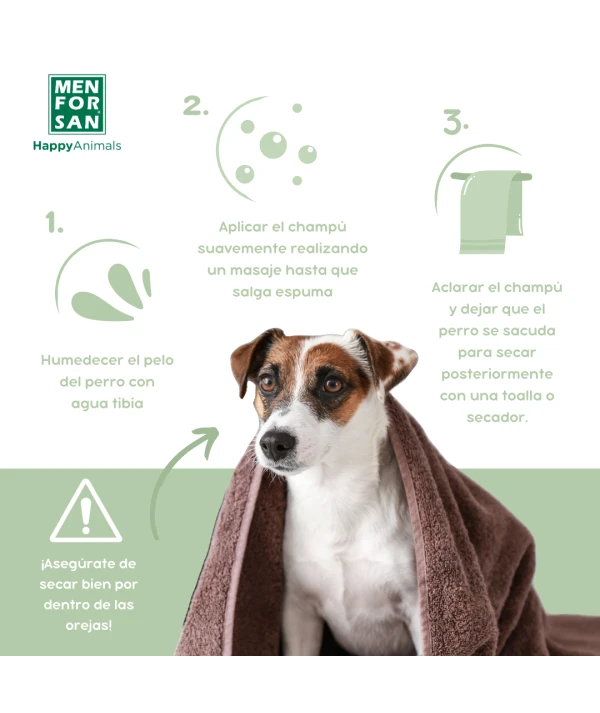 Humedecer el pelaje con abundante agua tibia Aplicar el champĂș en cuello, lomo, manos y patas. Masajear hasta conseguir una abundante y cremosa espuma y dejar actuar unos instantes.Aclarar y dejar que el perro se sacuda Secar con toalla y eliminar los restos de humedad con un secador mientras se cepilla el pelo.