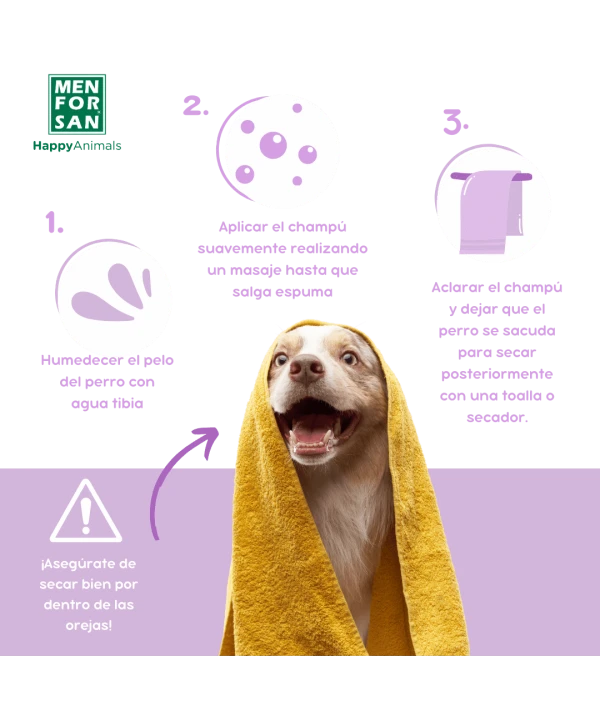 Humedecer el pelaje con abundante agua tibia. Aplicar el champĂș en cuello, lomo, manos y patas. Masajear hasta conseguir una abundante y cremosa espuma y dejar actuar unos instantes. Aclarar y dejar que el perro se sacuda. Secar con toalla y eliminar los restos de humedad con un secador mientras se cepilla el pelo.