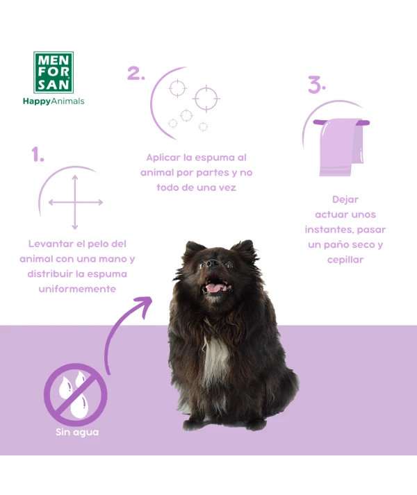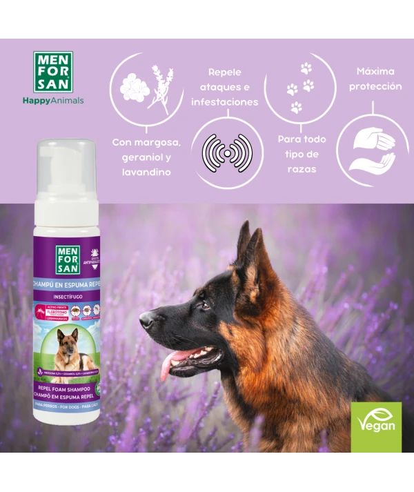 Limpia y actĂșa en cualquier parte del cuerpo y del pelaje de perros sin utilizaciĂłn de agua. La espuma contiene 3 activos naturales, MARGOSA, GERANIOL y LAVANDINO que funcionan como repelentes de infestaciones de todo tipo de insectos parĂĄsitos y voladores (pulgas, garrapatas, chinches, ĂĄcaros y mosquitos).