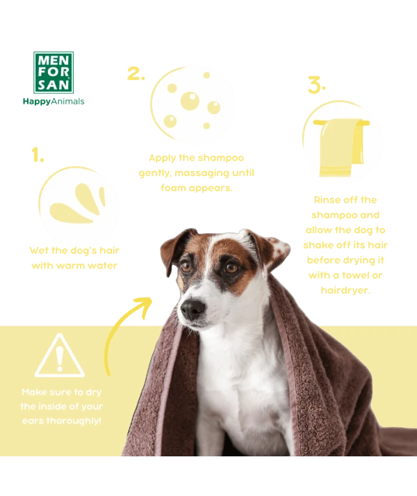 Humedecer el pelaje con abundante agua tibia. Aplicar el champĂș en cuello, lomo, manos y patas. Masajear hasta conseguir una abundante y cremosa espuma y dejar actuar unos instantes. Aclarar y dejar que el perro se sacuda. Secar con toalla y eliminar los restos de humedad con un secador mientras se cepilla el pelo.