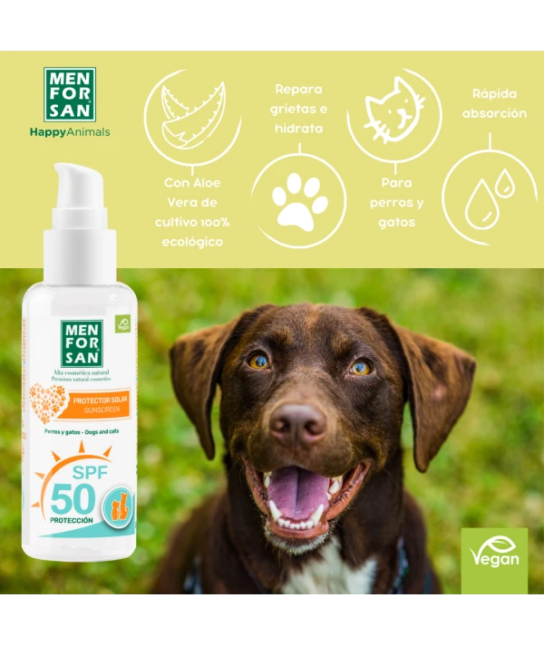 Leche solar con factor de protección 50 para hidratar y proteger las partes más sensibles de la piel de nuestro perro y gato de las peligrosas radiaciones UVA y UVB. Formula hipoalergénica y sin perfume.