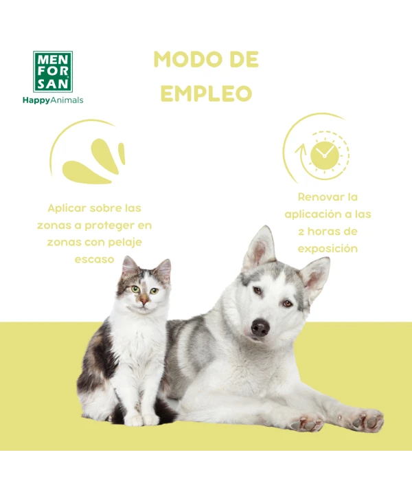 Aplicar sobre las zonas a proteger en zonas con pelaje escaso como el abdomen, las orejas, hocico, parpados, labios o en la zona trasera superior de razas con pelajes claros o sin pelo. Renovar la aplicación a las dos horas de exposición solar para asegurar una máxima protección.
