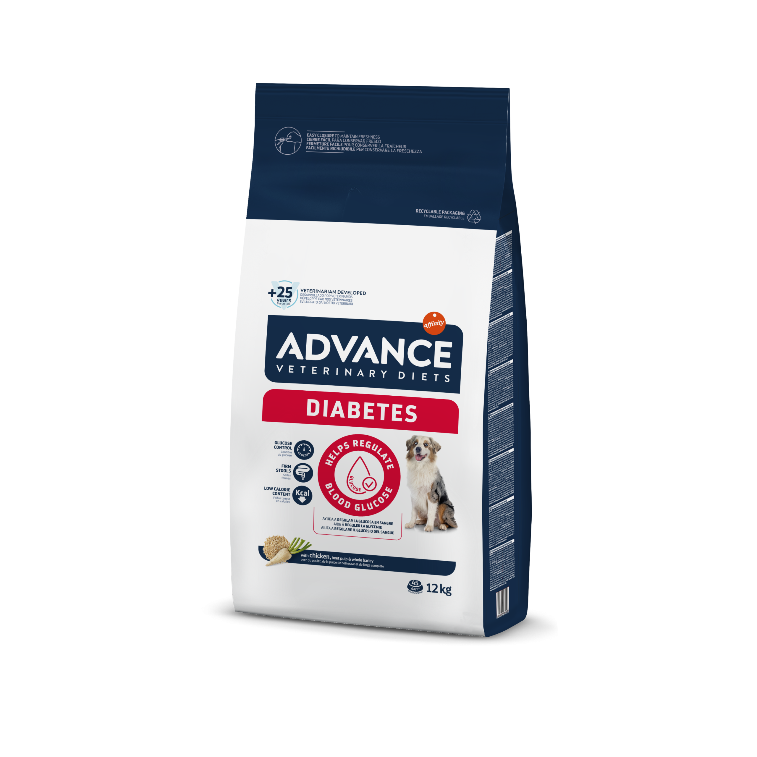 «ADVANCE VETERINARY DIETS Diabetes es un alimento dietético completo para perros adultos formulado para controlar el aporte de glucosa (diabetes mellitus) y compensar la mala digestión. Proporcionando un nivel bajo de carbohidratos de liberación rápida de glucosa, ingredientes muy digestibles y un contenido bajo en grasa. Su alto contenido en fibras solubles facilita el tránsito intestinal y favorece una microbiota intestinal saludable. Además, su fórmula baja en calorías le ayuda a controla su peso y tiene un gran sabor lo que facilita la alimentación diaria en perros con diabetes o colitis.