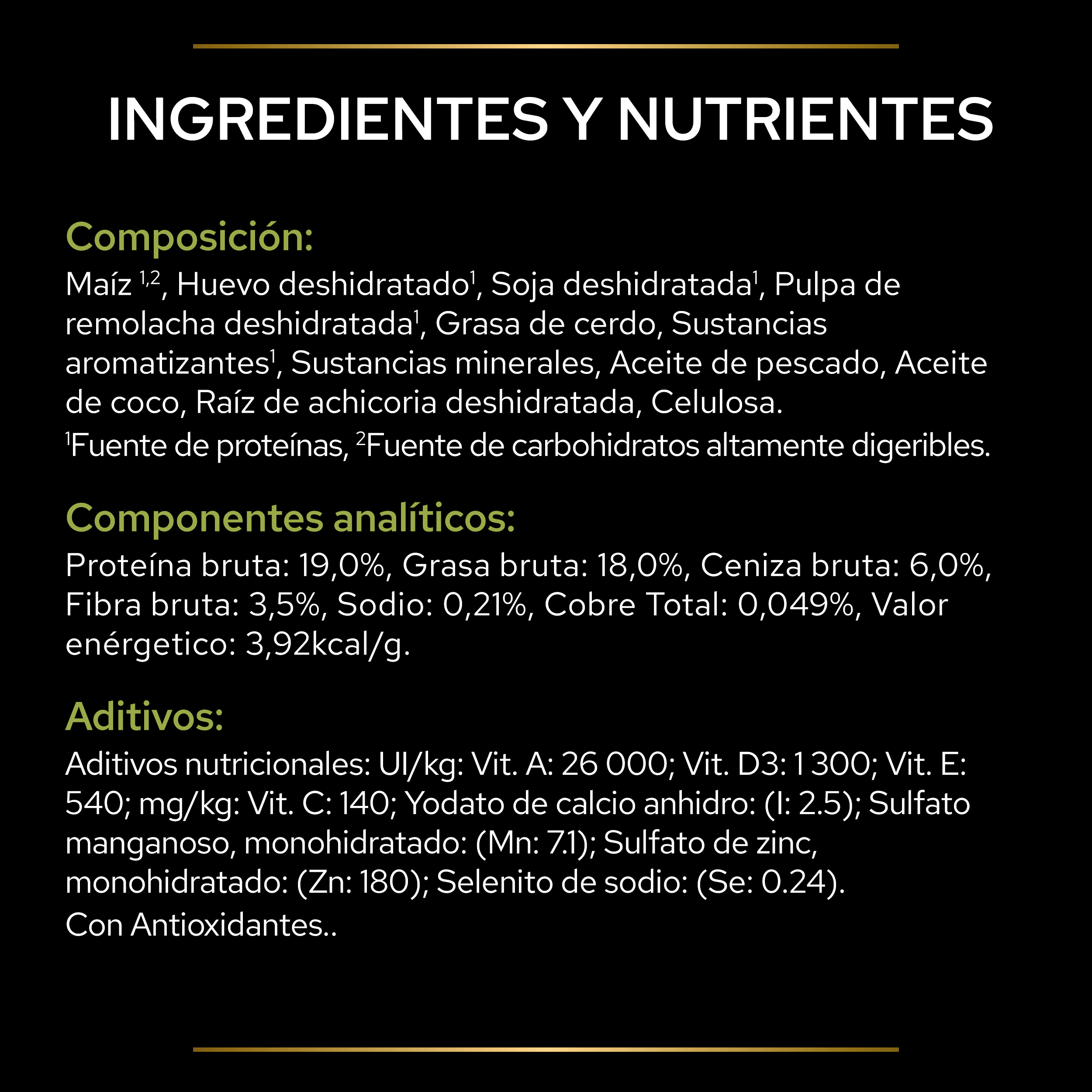 Con proteína altamente digestible (al menos 90% proveniente del huevo y de origen vegetal) para ayudar a mantener la función hepática»