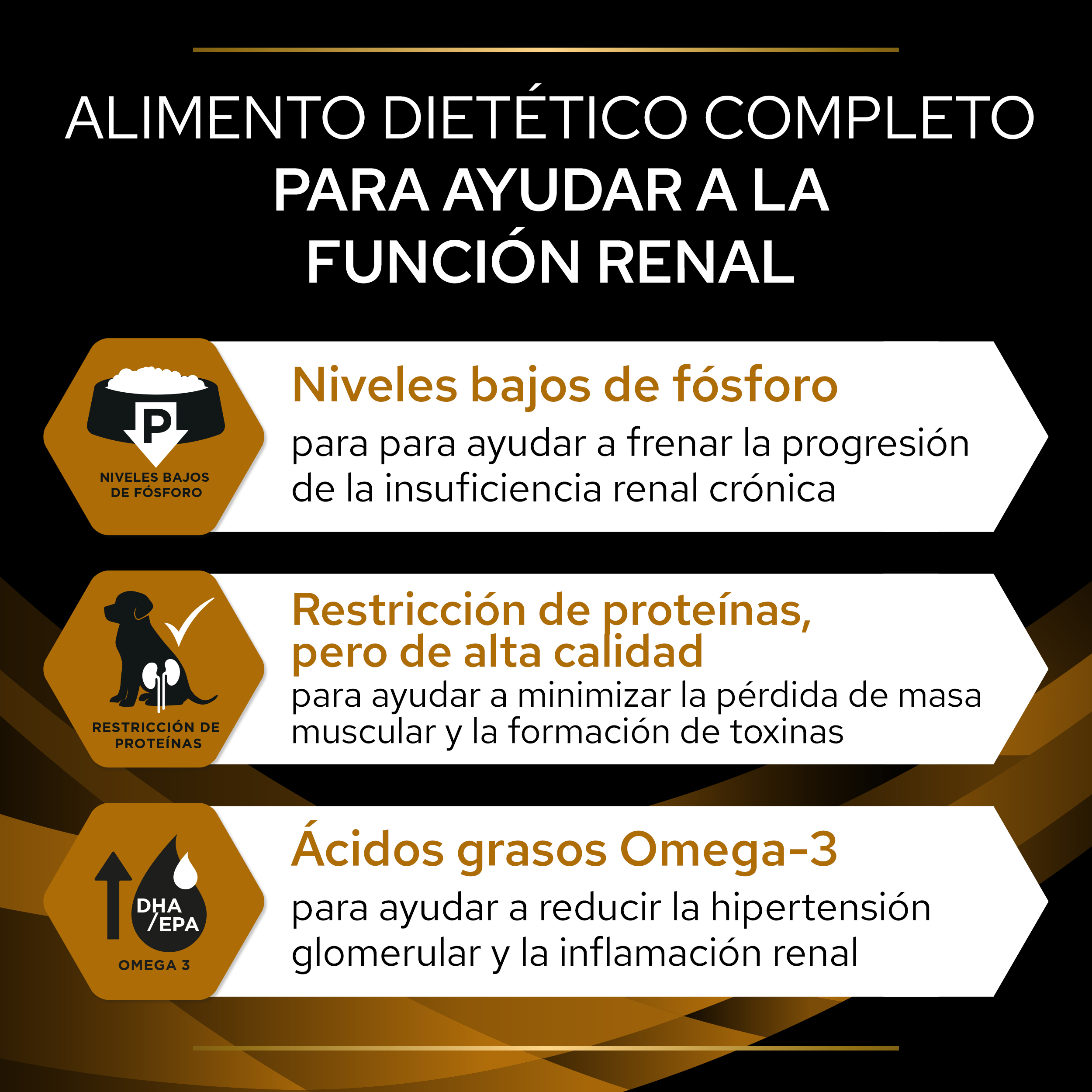 Niveles bajos de fósforo para apoyar nutricionalmente la insuficiencia renal crónica, junto con niveles controlados de proteína de alta calidad para ayudar a apoyar el mantenimiento de la masa muscular