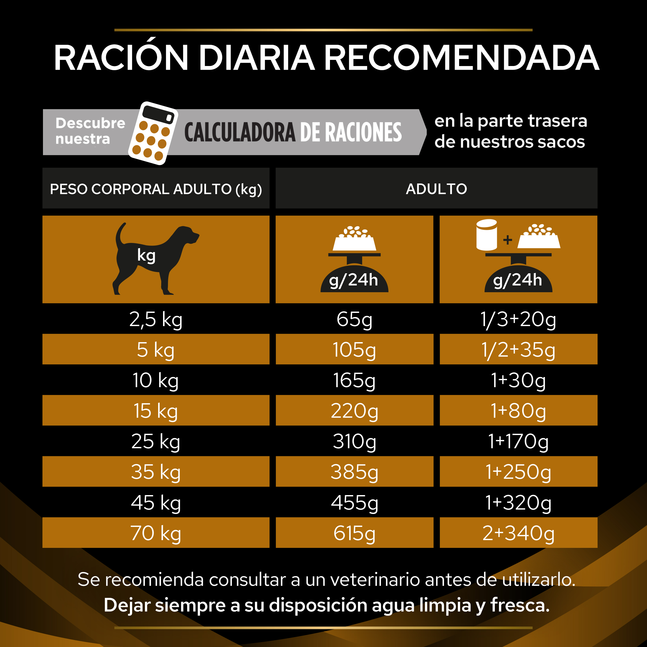 Para perros de más de 70 kg: por cada 5 kg adicionales de peso corporal, añadir 25 g de alimento seco.