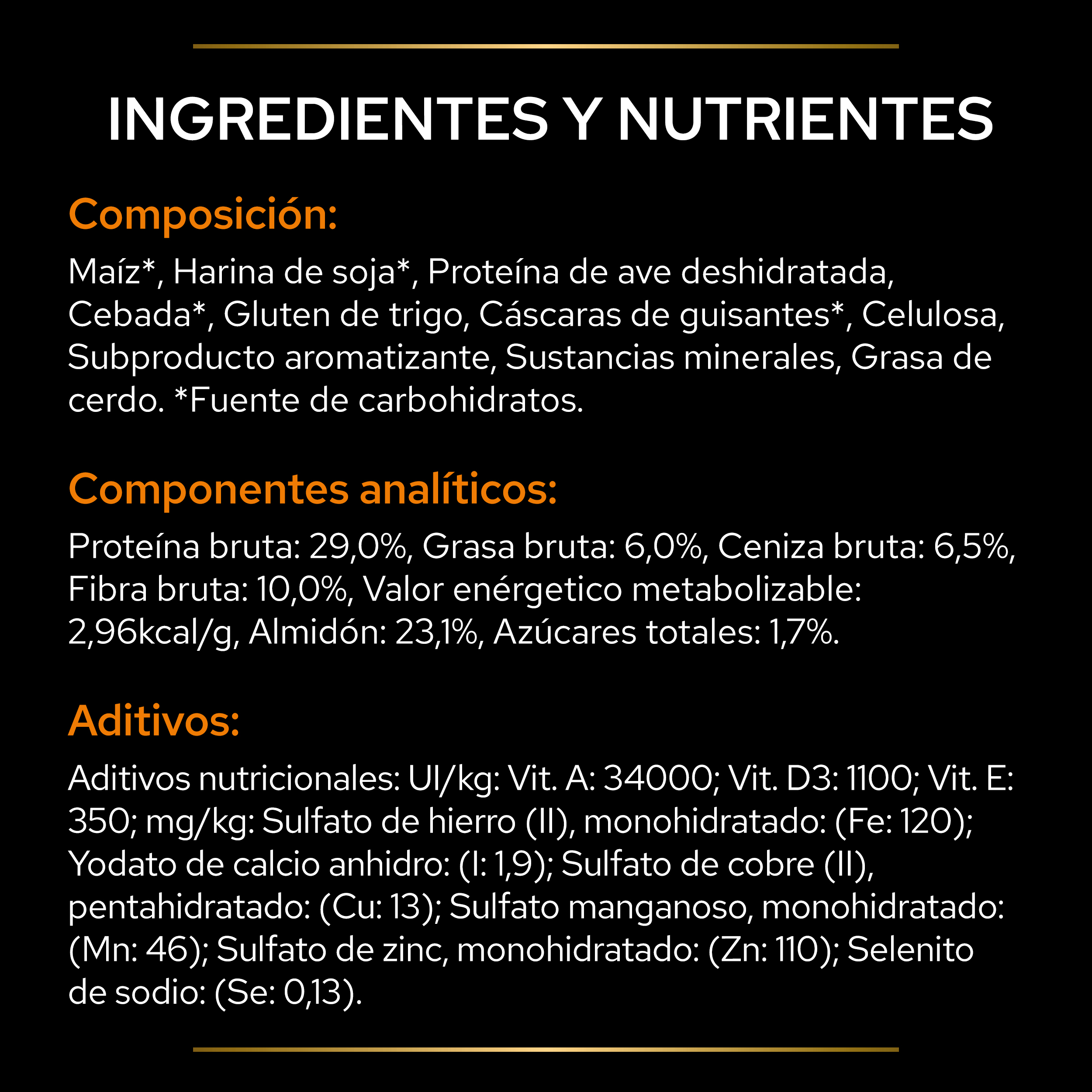 mg/kg: Sulfato de hierro (II), monohidratado: (Fe: 170); Yodato de calcio, anhidro: (I: 2,7); Sulfato de cobre (II), pentahidratado: (Cu: 18); Sulfato manganoso, monohidratado: (Mn: 64); Sulfato de zinc, monohidratado: (Zn: 160); Selenito de sodio: (Se: 0,18).